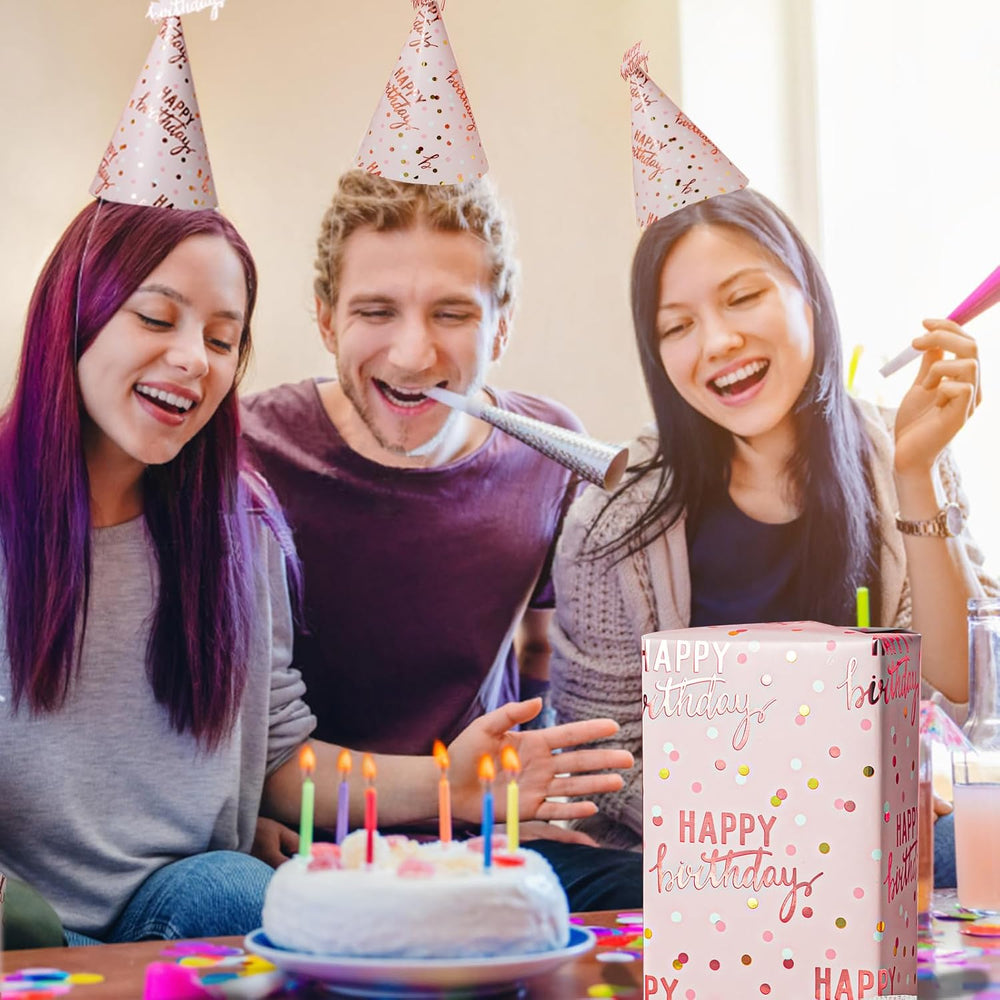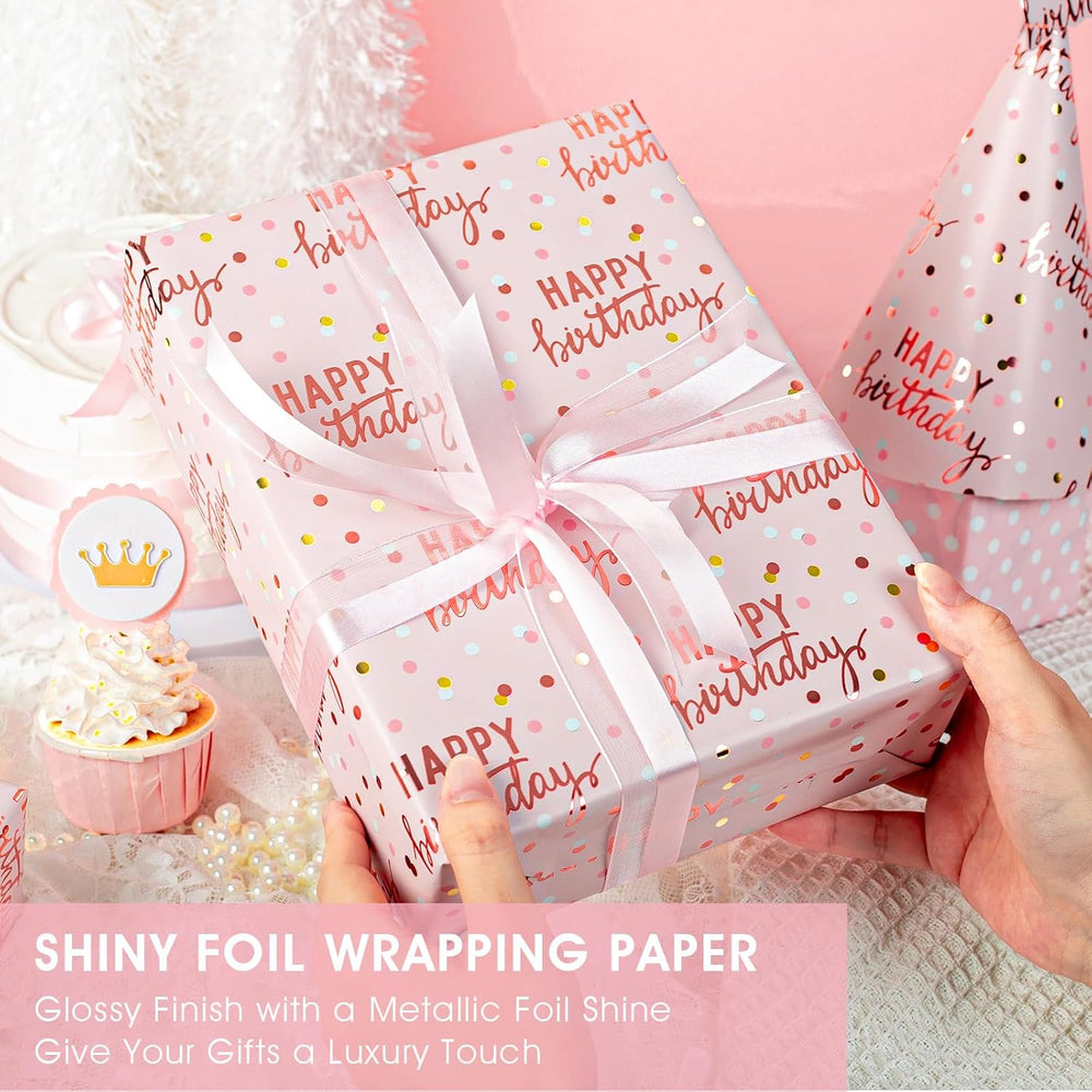| Pink Birthday Wrapping Paper: Celebrate In Style With Our Vibrant Cheerful Polka Dot, And "Happy Birthday" Lettering Wrapping Paper, The Shimmering Gold And Pink Accents Create A Festive And Stylish Vibe, Add A Luxurious Touch To Your Gifts Birthday Wrapping Paper Girls: Rose Gold Wrapping Paper Birthday Comes With A Roll Of 17" X 33Ft, Providing You With A Total Of 46.8 Square Feet Of Paper, Enough To Wrap Small And Medium Gifts. Please Confirm Gift Size Before Placing Order Shiny Thick Paper: Happy Birthday Wrapping Paper For Women Made Of Metallic Foil Paper, Thick And Not Easily Tear Or Rip. Adding A Luxurious Glow To Your Presents, Make Every Gift As Dazzling As The Occasion Itself; While Design The Grid Backing For Easy Cutting All Occasions: Sweet Pink Wrapping Paper For Girls Paper Is Perfect For Kids And Grown-Ups Alike And Can Be Used For Holidays Or For Birthdays Throughout The Entire Year. Also Use As Gift Wrapping (Of Course!), Crafts, Home, Party Decor And Drawer Liners, For Scrapbooking, Book Covering Get Creative: Simple Yet Stylish Girl Wrapping Paper Is The Perfect Complement To All Of Your Gift Wrapping, Let'S Create Wonderful Gift Wrapped Present With Girl Wrapping Paper Roll. You Will Definitely Make Someone Happy Even Before Opening The Gift