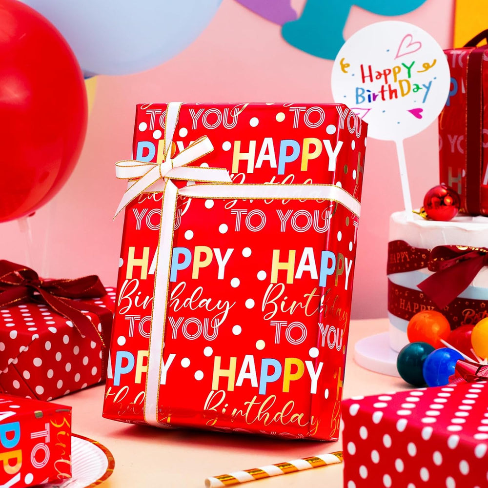 | Birthday Design: Our Wrapping Paper Roll Classic "Happy Birthday To You" Text With Glitter Metallic Foil Printed On Rose Red Paper, Coordinated Polka Dots Printed On The Reverse. Mini Roll: Total 1 Roll Wrapping Paper. It Measures 17.3 Inches Wide By 32.8 Feet Long. 47.3 Total Square Feet In The Set. These Rolls Are Not A Standard Width, More Narrow Than Usual Size Premium Quality: Created With High-Quality Paper Materials, Thick And Not Easily Tear Or Rip. Item Came With Shrink Film To Prevent Wrapping Paper From Scratches And Reduce Dust Use All Occasion: Perfect For Birthday, Party, Graduations, Gifts Wrap, Holiday And More.It Is Also Great For Craft Project, Wall And Bulletin Board Decorations, Greeting Card Decorations Quality