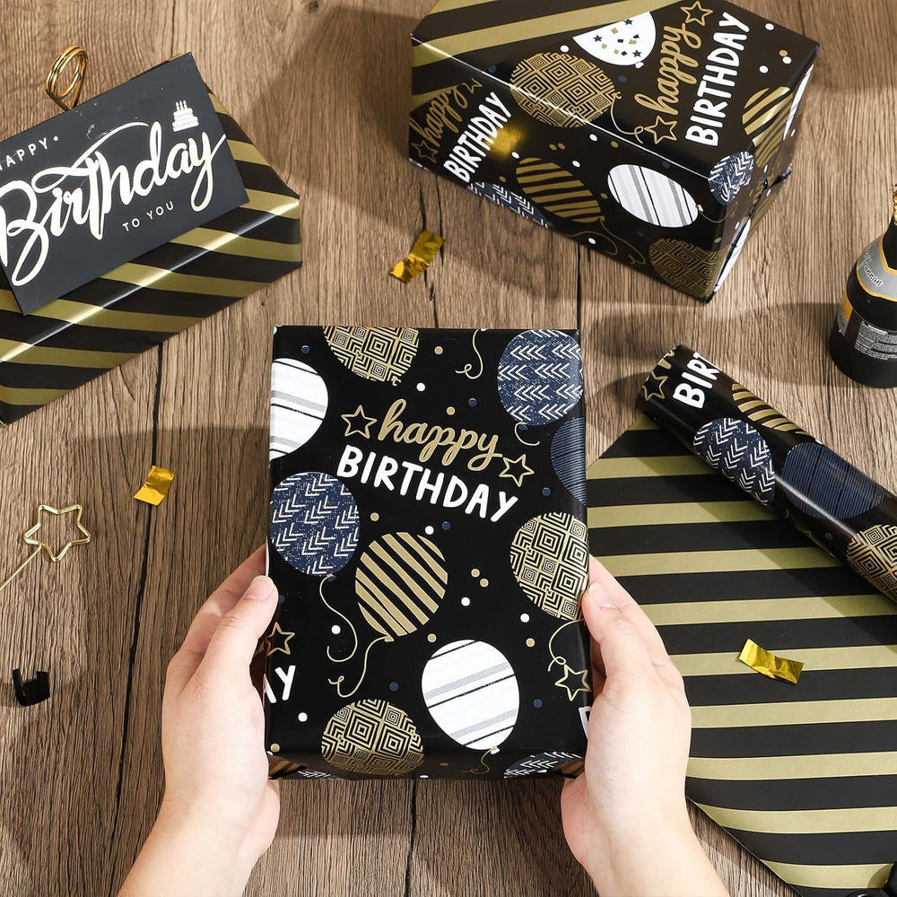 | Reversible Deaign: Black Gold Balloons And Birthday Greetings Printed On One Black Side, Birthday Greetings Printed On The Reverse. Two Different Designs Add A Festive And Luxurious Touch To Every Gift High-Quality Material: Made From Durable Coated Paper, Ensuring A Tear-Resistant, Eco-Friendly Option For Gift Wrapping Jumbo Roll Size: Each Roll Measures 30 Inches Wide And 32.8 Feet Long, Offering Plenty Of Paper For Multiple Gift-Wrapping Occasions Perfect For Birthdays: Adorned With Happy Birthday Text Patterns, This Wrapping Paper Is Perfect For Birthday Celebrations, Making Gifts Look Exciting And Festive Versatile For Various Occasions: Suitable Not Only For Birthday Gifts But Also For Themed Parties, Holidays, And Craft Projects, Making It A Versatile Choice For Different Celebrations