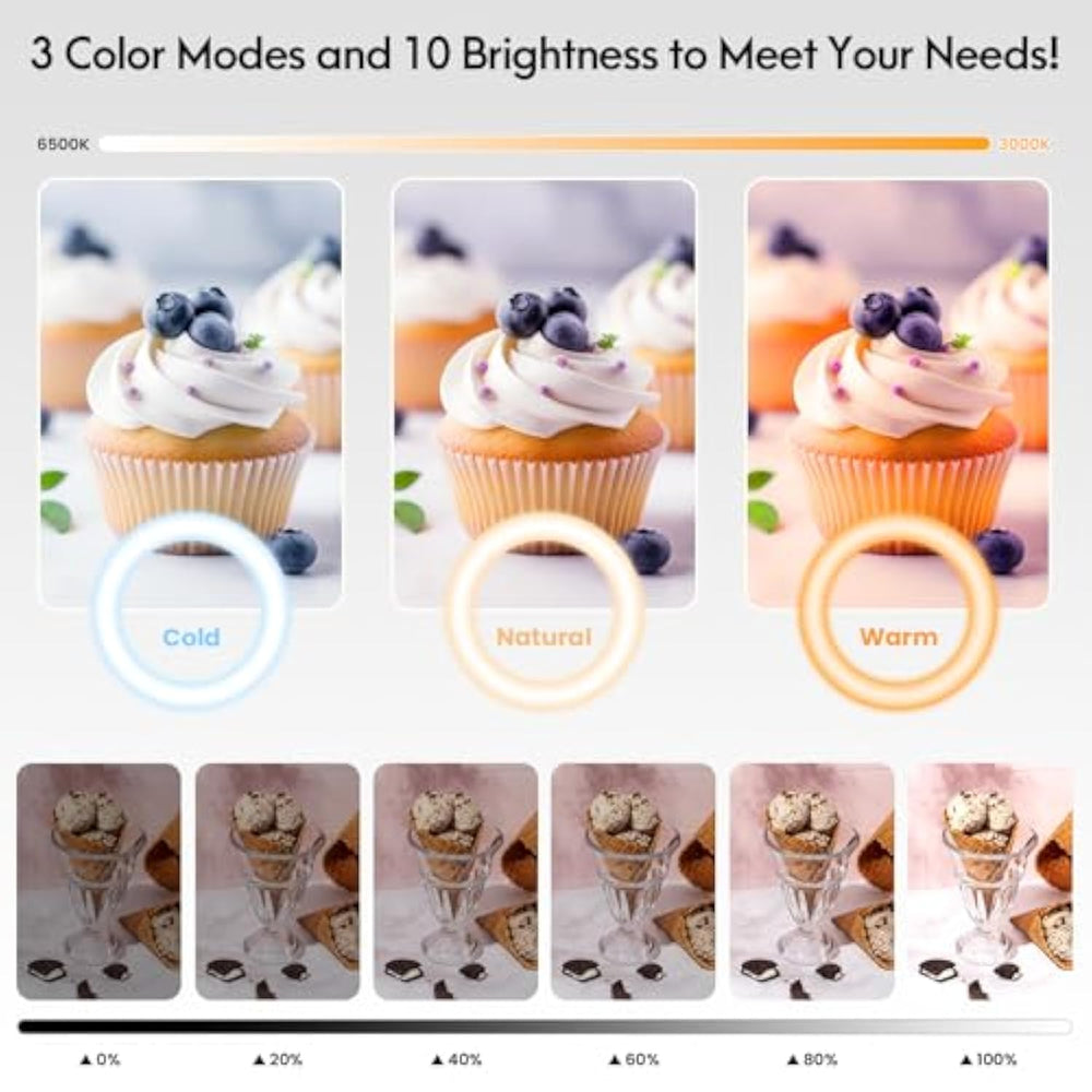 ?A Movable Tripod?The Overhead Tripod Features Three Heavy-Duty Casters. When You Need To Switch Shooting Scenes Or Angles, These Movable Casters Provide Great Convenience. The Casters Are Covered With A Layer Of Silicone, Ensuring Noiseless Movement. | | ?Shadow-Free Shooting?The Market Shooting Devices Place The Phone Below The Light, Causing The Phone To Block The Light And Create Shadows Underneath. Ring Light With Stand Places The Phone In The Center Of The Ring Light, Ensuring That The Light Is Not Obstructed And Your Photos Are Shadow-Free. | | ?Stable And Vibration-Free?The Tripod For Iphone With Light Is Made Of Metal, With Each Wheel Weighing 1 Pound. The Phone Tripod With Light Can Support Up To 3.3 Pounds Of Equipment Without Any Drop-Off. The Phone Holder (Including Two Holders) Can Rotate 360°, Making It Compatible With Nearly All Phones. | | ?3 Colors And 10 Brightness Levels?The Led Ring Light For Phone Offers Three Colors Of Light: White, Natural, And Yellow.