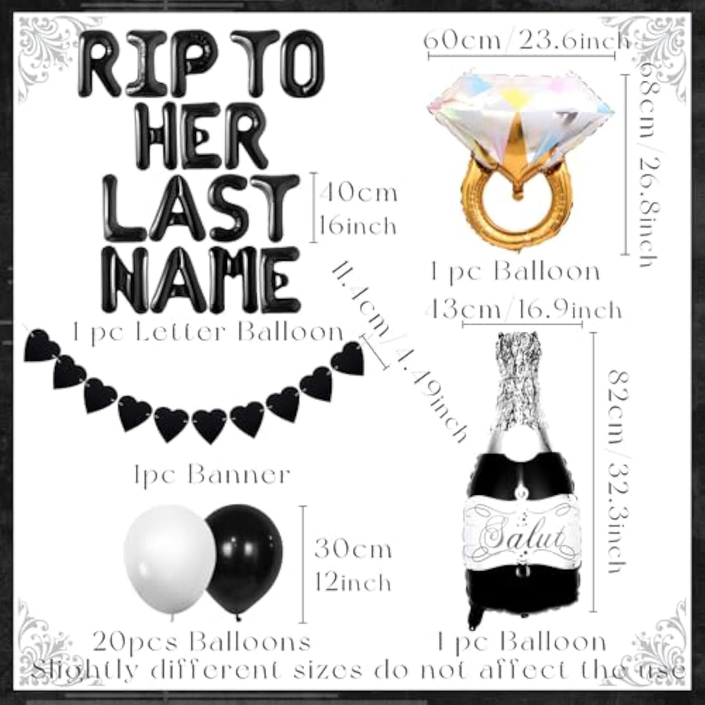| Enjoy Our Rip Single Last Name Party Decoration. Very Suitable For Any Bachelorette Party! | | Our Gothic Bachelorette Party Supplies Will Make Your Party More Interesting And Immerse Your Family And Guests In An Unforgettable Experience. | | You Will Get: 1 X Black Bottle, 1 X Gold Ring Balloon, 20 X Black White Balloons,1 X Black Heart Banner, 1 X Rip To Her Last Name Letter Balloon 16 Inch. | | Beautiful Design, Not Easy To Damage, May You Use It Happily. | | Have A Bachelorette Party With Your Friends! Our Kindness Towards Your Bachelorette Party Supplies Will Impress Your Friends. | |