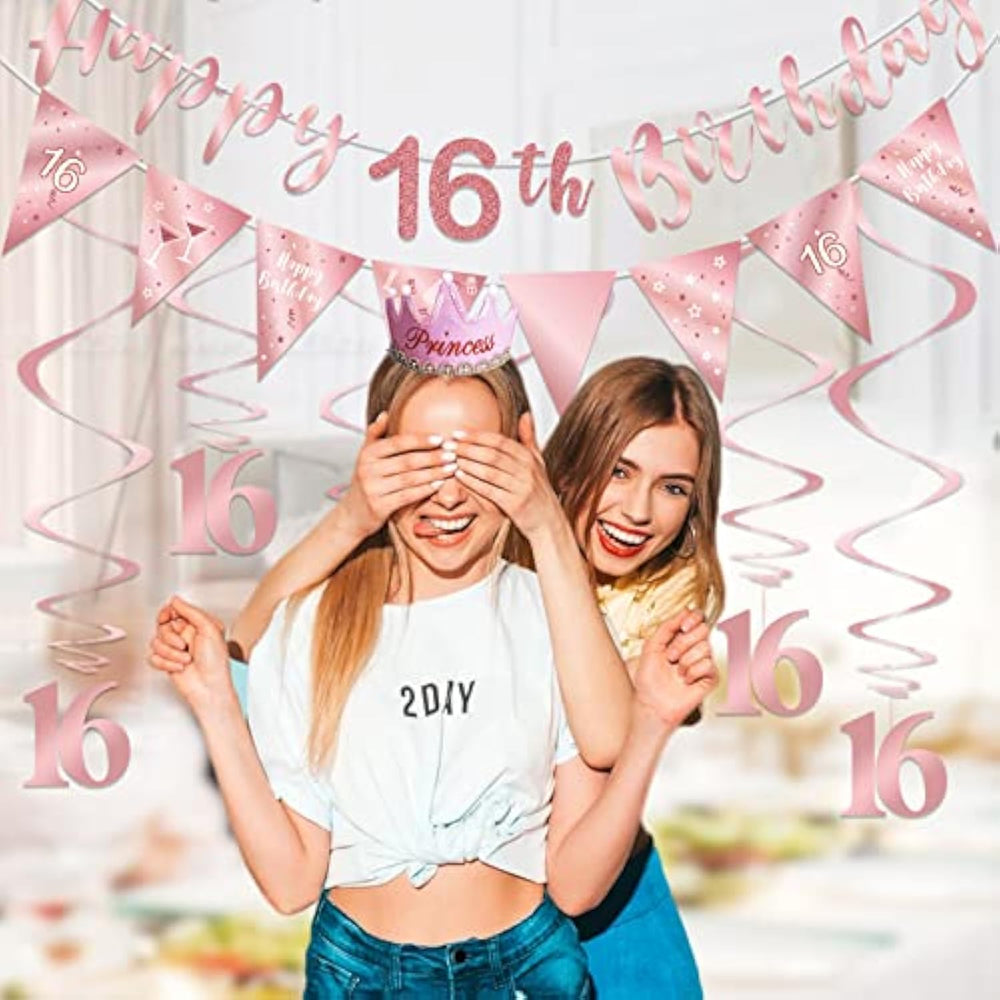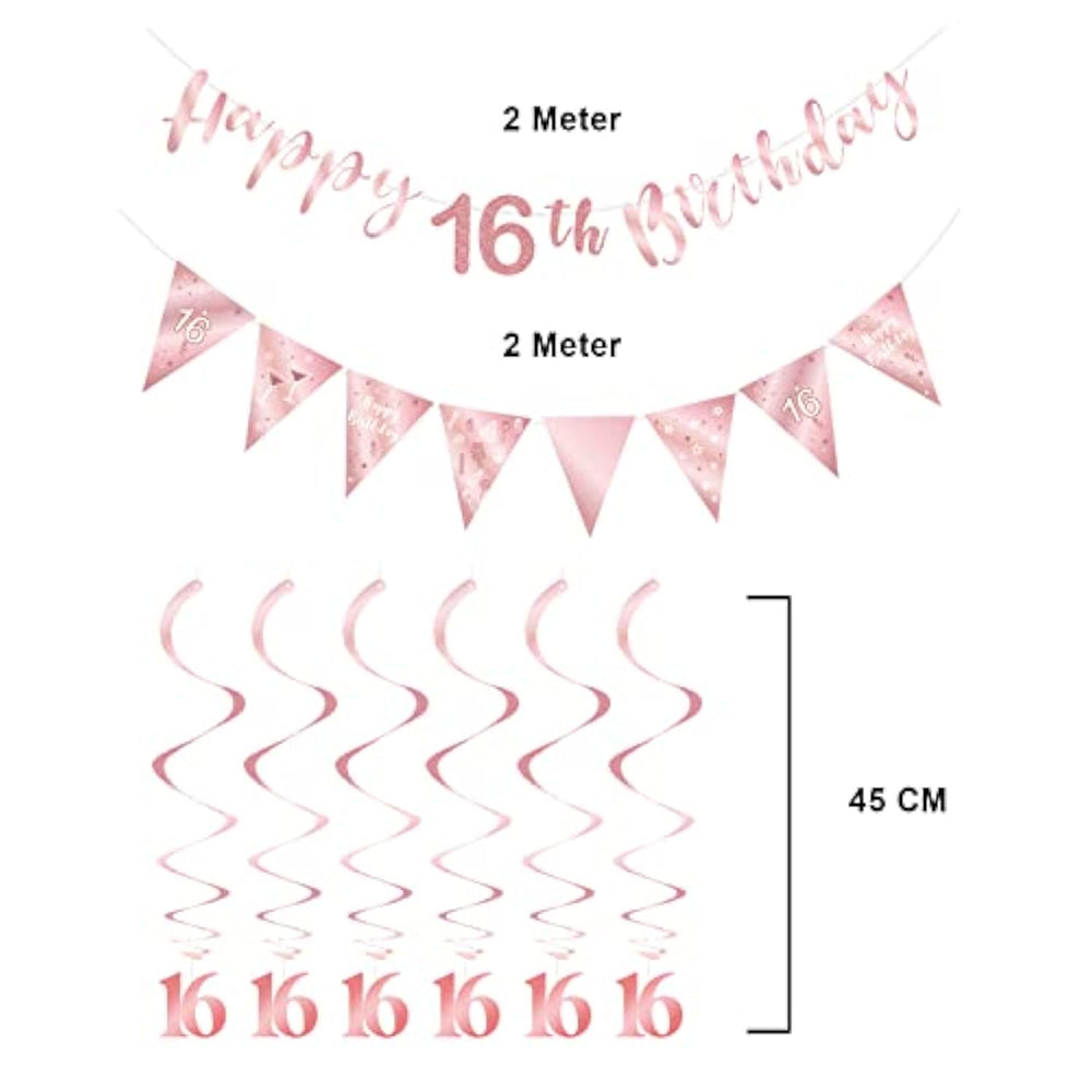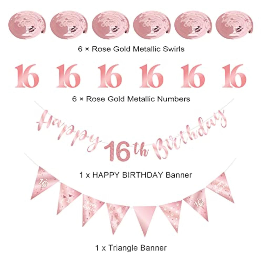 | The Package Includes: Happy 16Th Birthday Banner(1 Set), Triangle Banner(1 Set), Hanging Swirls(6 Pcs). | | Quality And Specification: The Happy Birthday Banner And Triangle Banner Are Made From Sturdy High Quality Eco-Friendly Cardstock. | | Hanging Swirls: Made From Shiny Foil Material. Every Swirl With A Plastic Loop At The Top For Easy Hanging. Fun Decoration For Your 16Th Birthday Party. | | Wide Application: Hang Them From The Ceiling, Above A Table, Under The Veranda, Or From Branches In Trees. Use Them To Create A Dreamy Background For Your Birthday Party. | | Product And