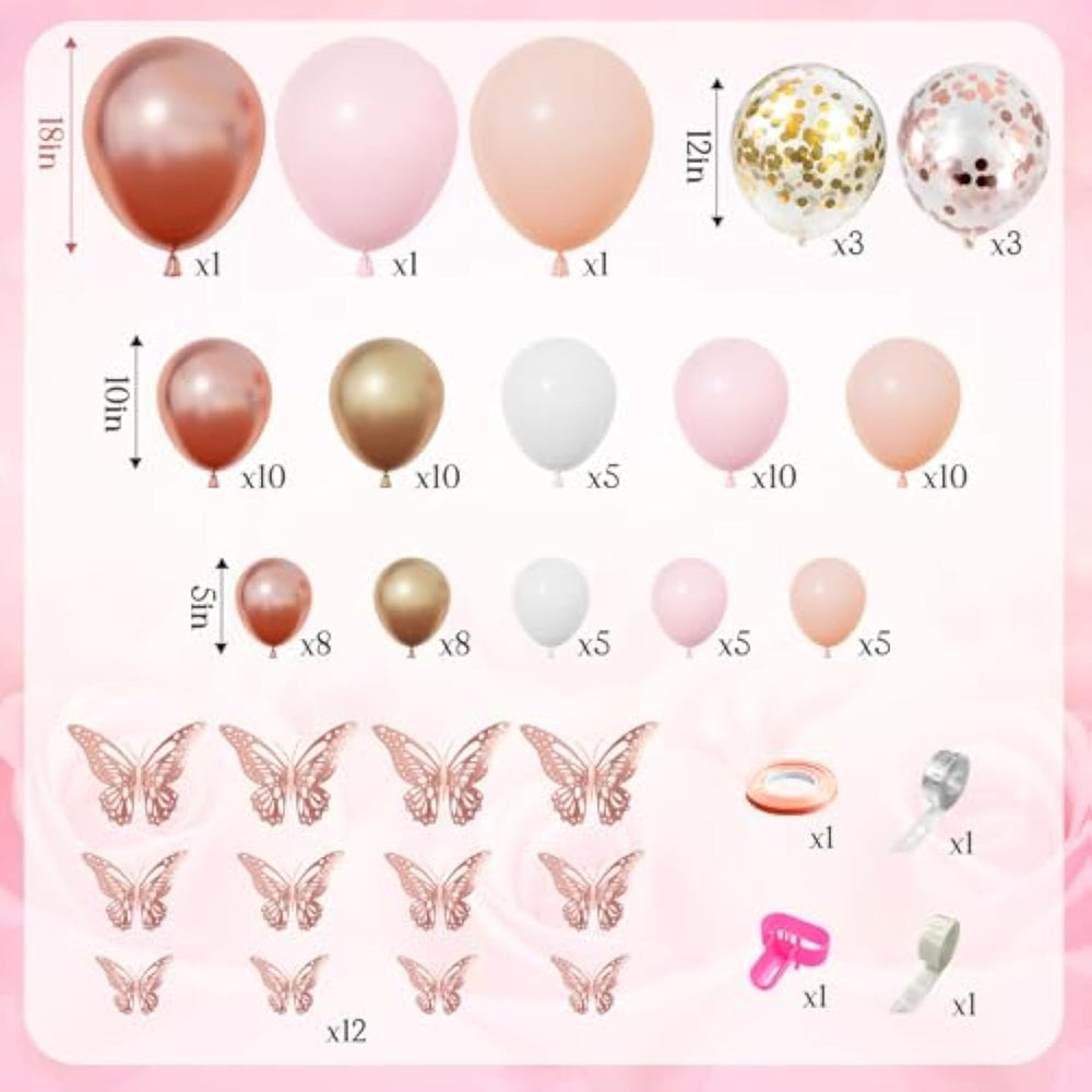 This all-in-one rose gold balloon decoration kit includes 135 pieces to help you effortlessly create a stunning party setup. It features 4 baby boxes, a full set of A-Z letters plus "BABY," 3D butterfly stickers, a variety of metallic, pastel, confetti, and foil balloons in different sizes, and essential tools like arch strips, ribbon, tying tools, and glue dots. Made from high-quality, non-toxic latex, these balloons are safe for kids and can be filled with air or helium. Easy to assemble in just 30 minutes, this kit is perfect for baby showers, birthdays, weddings, or any rose gold-themed celebration. Whether hung on walls, doorways, or tables, it adds a stylish and memorable touch to any event