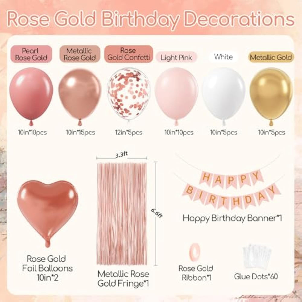 | What You Will Get: The Rose Gold Birthday Decorations Include 10Inch Metallic Rose Gold Balloonsx15, 10Inch Pearl Rose Gold Balloonsx10, 10Inch Light Pink Balloonsx10, 10Inch White Balloonsx5, 10Inch Metallic Gold Balloonsx5, 12Inch Rose Gold Confetti Balloonsx5, Metallic Rose Gold Fringe Curtainx1, Pink Happy Birthday Bannerx1, 10Inch Rose Gold Foil Balloonsx2, Rose Gold Ribbonx1, Glue Dotsx60 | | Comprehensive Birthday Decorations: Our Rose Gold Party Decorations Package Is Filled With A Variety Of Carefully Curated Items, All Designed To Match Your Birthday Celebration. Say Goodbye To The Tedious Task Of Hunting Down Multiple Accessories, Saving You Time And Energy So You Can Focus On Enjoying The Party! | | Easy To Assemble: This Rose Gold Party Decorations Set Includes Glue Dots, Ribbons, Allowing For Easy Setup Of Your Birthday Decorations. You Can Display Banners And Balloons On Walls, Doors, Or Any Space, Whether Indoors Or Outdoors. These Decorations Add Charm To Your Party | | Wide Application?The Rose Gold Happy Birthday Kit Is Good For Various Occasions, That Include Rose Gold Birthday Decorations For Women, Can Be Used As 16Th, 18Th, 21St, 25Th, 30Th, 40Th, 50Th, 60Th, 70Th Birthday Party Decorations | | Warm Reminder: We Are Dedicated To Providing Good Service. If You Have Any Issues With The Birthday Party Decorations Kit. We Will Work Hard To Solve It | |