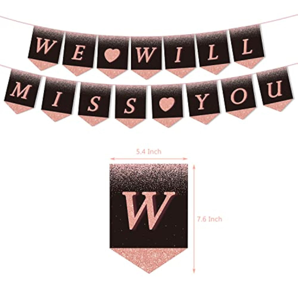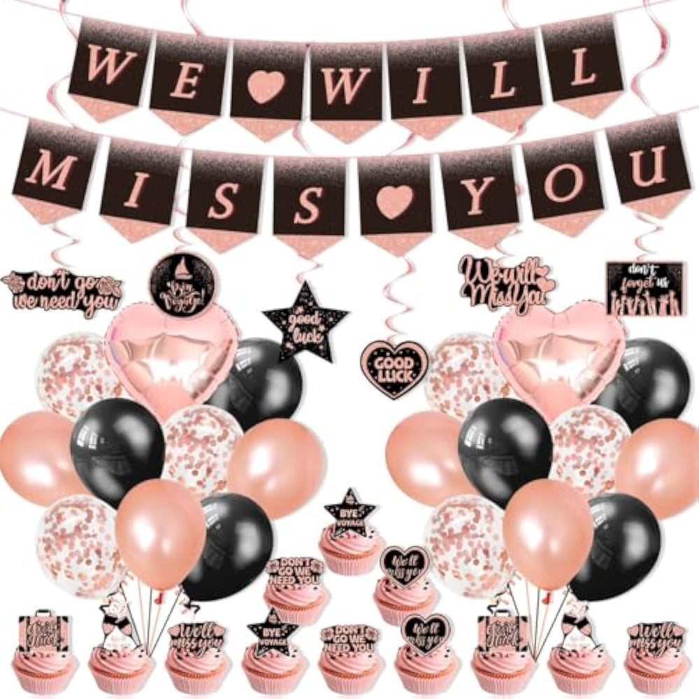 | Farewell Party Decorations-You Will Receive 1 We Will Miss You Banner,6 Black Rose Gold Hanging Swirls,2 Foil Balloons(18”), 6 Rose Gold Latex Balloons(12”), 6 Rose Gold Sequined Balloons(12”), 6 Black Latex Balloons(12”)?12 Cupcake Toppers. | | Durable Material-Latex Balloons Are Made Of High-Quality Materials. Banners And Cake Topper Are Made Of Paper. Perfect For Farewell, Going Away, Retirement Party. These Balloons Are Not Easy To Break And Can Be Reused. | | Suitable Occasions-Suitable For Decorating Retirement, Going Away, Office Work, Job Change, Farewell Party. | | Easy To Assemble And Inflate-You Can Easy To Put These We Will Miss You Decorations Together. Foil Balloons And Latex Balloons Can Be Hung On The Window, Door, Ceiling, Wall, Fireplace Of Your Home Or Classroom, And They Can Also Be Decorated Outside, Such As Tree Branches, Yard, Celebrate With Your Classmates And Family. | | High Quality After-Sales Service: We Have Been Committed To Bringing