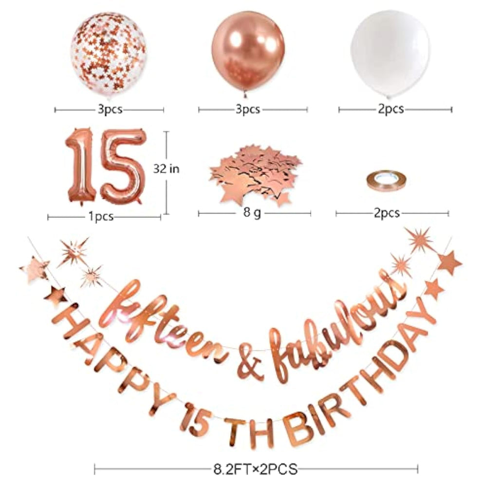 | Package Contains - One Rose Gold Fifteen Fabulous Banner Garland And One Rose Gold Happy 15Th Birthday Banner Garland, 1 Set Rose Gold Foil 15 Number Balloons, 3 Rose Gold Balloons, 2 White Balloons And 3 Rose Gold Star Confetti Balloons. 2 Pcs 10 Meters Rose Gold Ribbon.Each Banner String Is 8.2 Feet/2.5Meters Both Contains 4 Sparkling Twinkle Stars. | | Environmental Material - Our Fifteen And Fabulous Happy 15Th Birthday Banner Garland Kit Are Made With High Quality Double Sided Metallic Paper Cardstock, Shinning, Durable And Reusable. | | Easy Assembly: We Equiped Plastic Needle And Silver Thread. Just Hang Your 15Th Birthday Banner Decorations On The Walls,Windows, Dessert Tables, Gift Tables, Tree Branches, Fences, Hallway And Other Indoor And Outdoor Places You Like. It Comes With Lots Of String Left Over So You Can Tie It Off Easier Wherever You Need. | | Using Occasion - Perfect For Decorating Girls/Boys 15Th Birthday Party, 15 Year Old Birthday Decorations, 15Th Birthday Decorations For Girls, 15 Birthday Decorations For Boys, 15Th Anniversary, Happy 15Th Birthday Decorations, 15Th Birthday Party Supplies, Fifteen And Fabulous Birthday Decorations, 15 And Fabulous Birthday Decorations, Wedding, Bachelorette, Engagement, Bridal Shower, Graduation Ceremony, Valentines Day, Anniversary, Photo Backdrop And So On | |