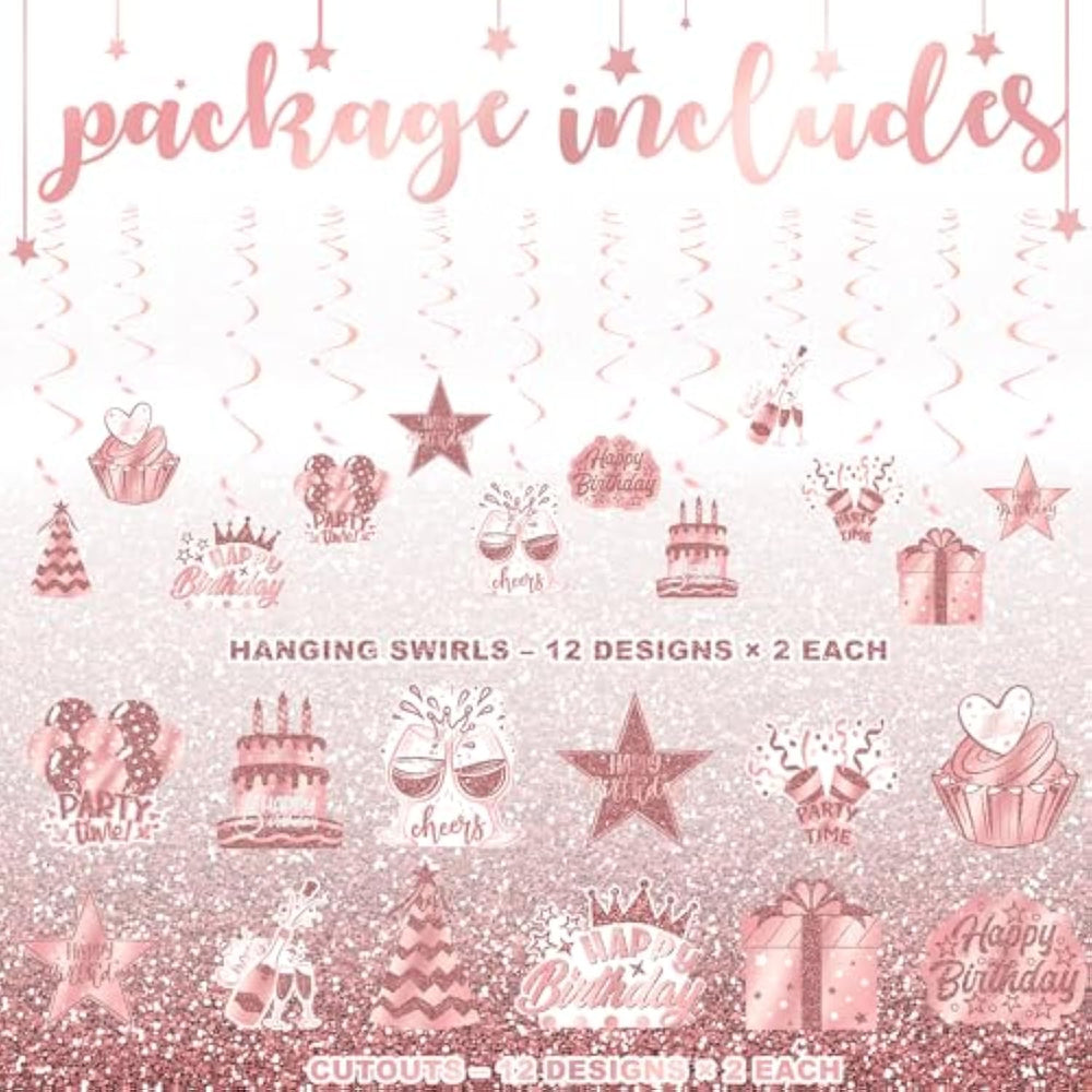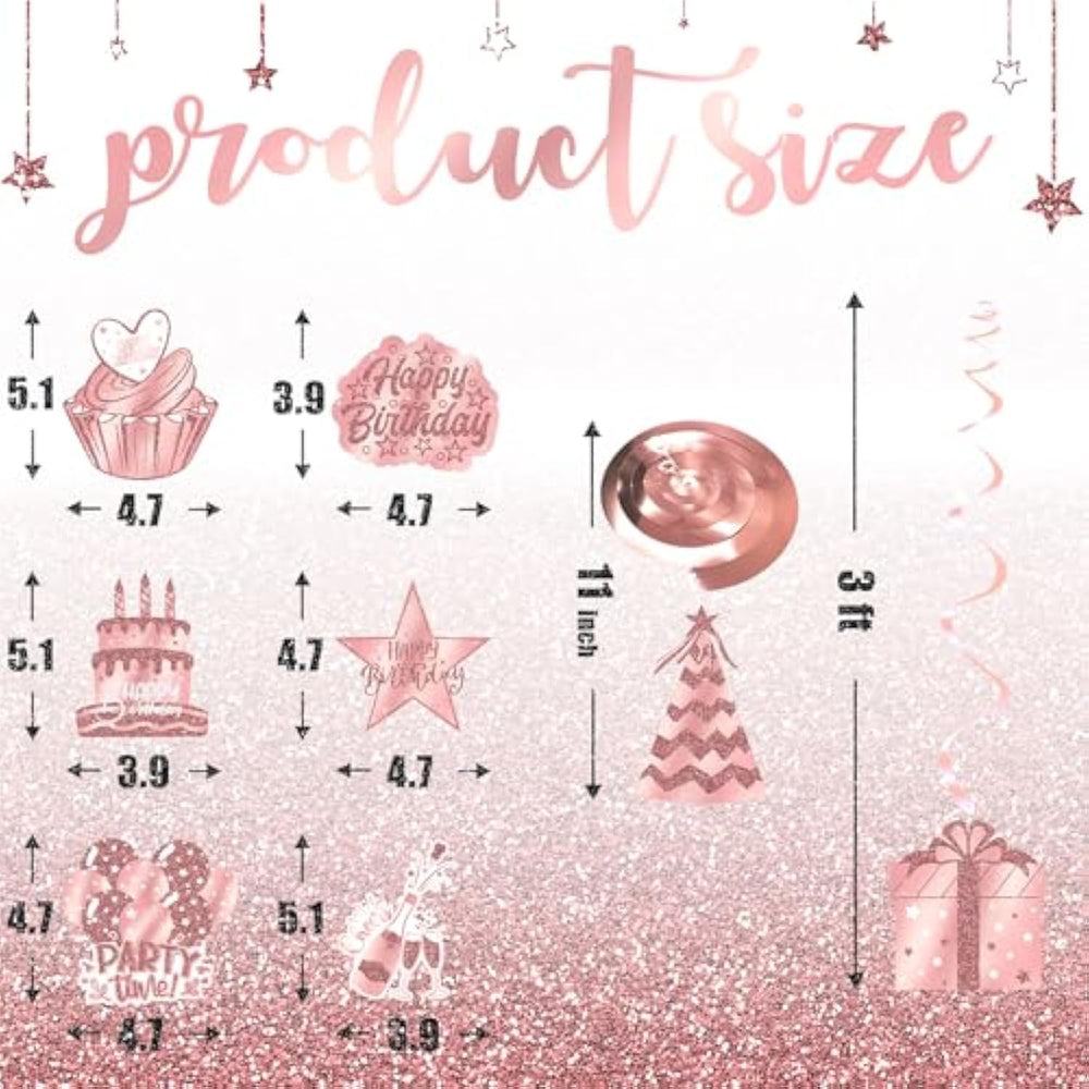 | Stylish Rose Gold Birthday Decorations: Includes 24 Hanging Swirls In Rose Gold With 12 Unique Birthday-Themed Cutouts Like Cakes, Gifts, And Champagne—Perfect Rose Gold Party Decorations For Girls, Women, Or Any Stylish Celebration. | | Great Value 48Pcs Set: Includes 24 Hanging Swirls With Attached Cutouts And 24 Additional Printed Cardstock Cutouts. Use The Extras On Walls, Tables, Or As Photo Props To Create A Fully Coordinated Party Setup. | | Pre-Assembled And Easy To Hang: Each Swirl Is Pre-Attached To A Plastic Hook, Making Setup Fast And Easy. Just Hang Them From Ceilings, Doorways, Or Over Party Tables To Instantly Elevate Your Decor. | | Durable And Reusable Materials: Made From Thick Printed Cardstock And High-Quality Foil Swirls, These Decorations Are Sturdy, Lightweight, And Reusable With Proper Care. | | Perfect For Feminine Celebrations: These Rose Gold Hanging Decorations Are Great For Milestone Birthdays Like 16Th, 18Th, 21St, 30Th, And Beyond. Ideal For Women, Teen Girls, Or Anyone Who Loves Rose Gold Aesthetics. | |