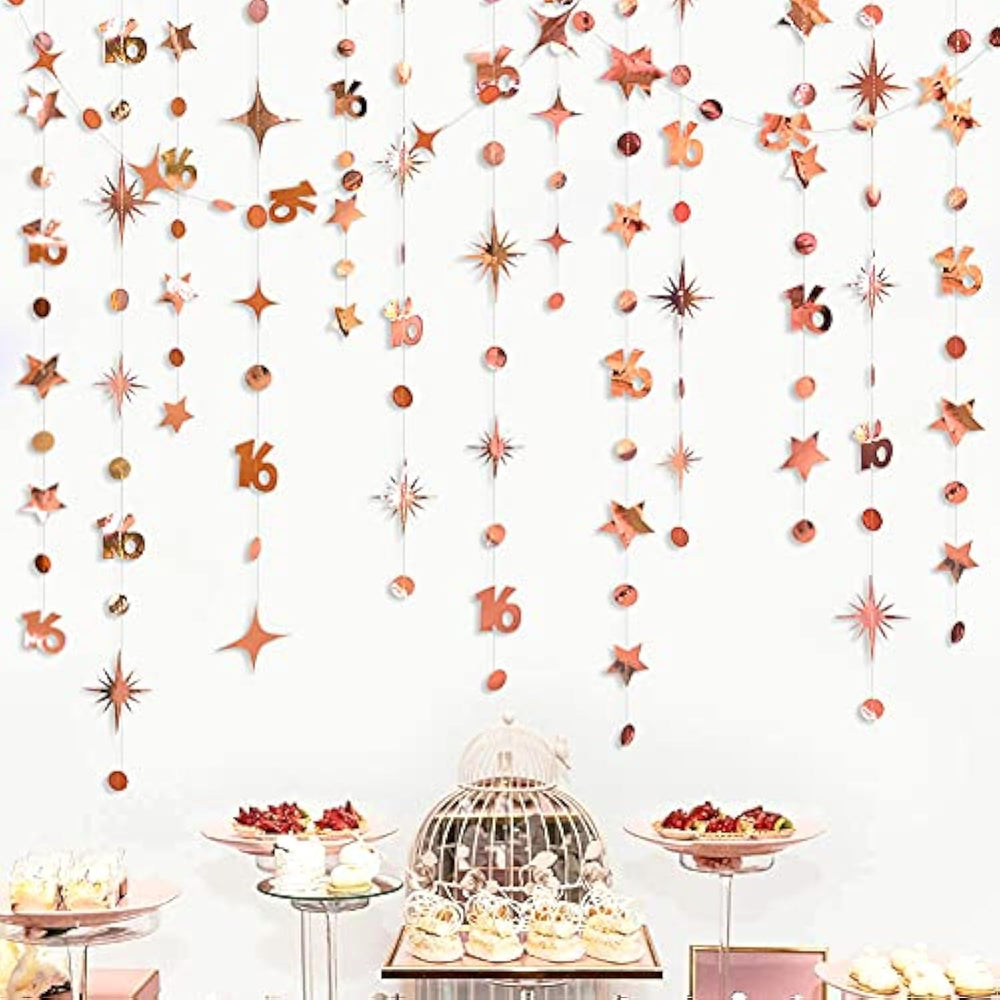 | ?? Package Includes - 4 Strings Of 11.5 Feet/3.5 Meters Rose Gold Number 16 Sparkling Twinkle Star And Circle Dots Garlands , Totally Is 46 Feet/14 Meters | | ??Environmental Material - Our Sweet 16 Party Decorations Garland Are Made With High Quality Double Sided Metallic Paper Cardstock, Carefully Hand-Made And Connected With Thread, Durable And Reusable In Nice And Bright Colors. | | ?? Adorable Party Décor- Our Rose Gold Number 16 Circle Dot Twinkle Star Garland Kit Is Perfct For Girls/Boys 16Th Birthday Party, Sweet 16 Decorations, 16Th Anniversary, Wedding, Bridal Shower, Birthday, Christmas, Barbecue, Home, Engagement, Christenings, Fetes, Etc | | ?? Easy To Assemble - Unravel The Entire String And Hang It Up With Care To Avoid Twist. Our Star And Circle Dot Garlands With Figure 16 Can Be Cut To Different Lengths. Just Hang It On The Walls,Windows, Dessert Tables, Gift Tables, Tree Branches, Fences, Hallway And Other Indoor And Outdoor Places You Like. | | ??