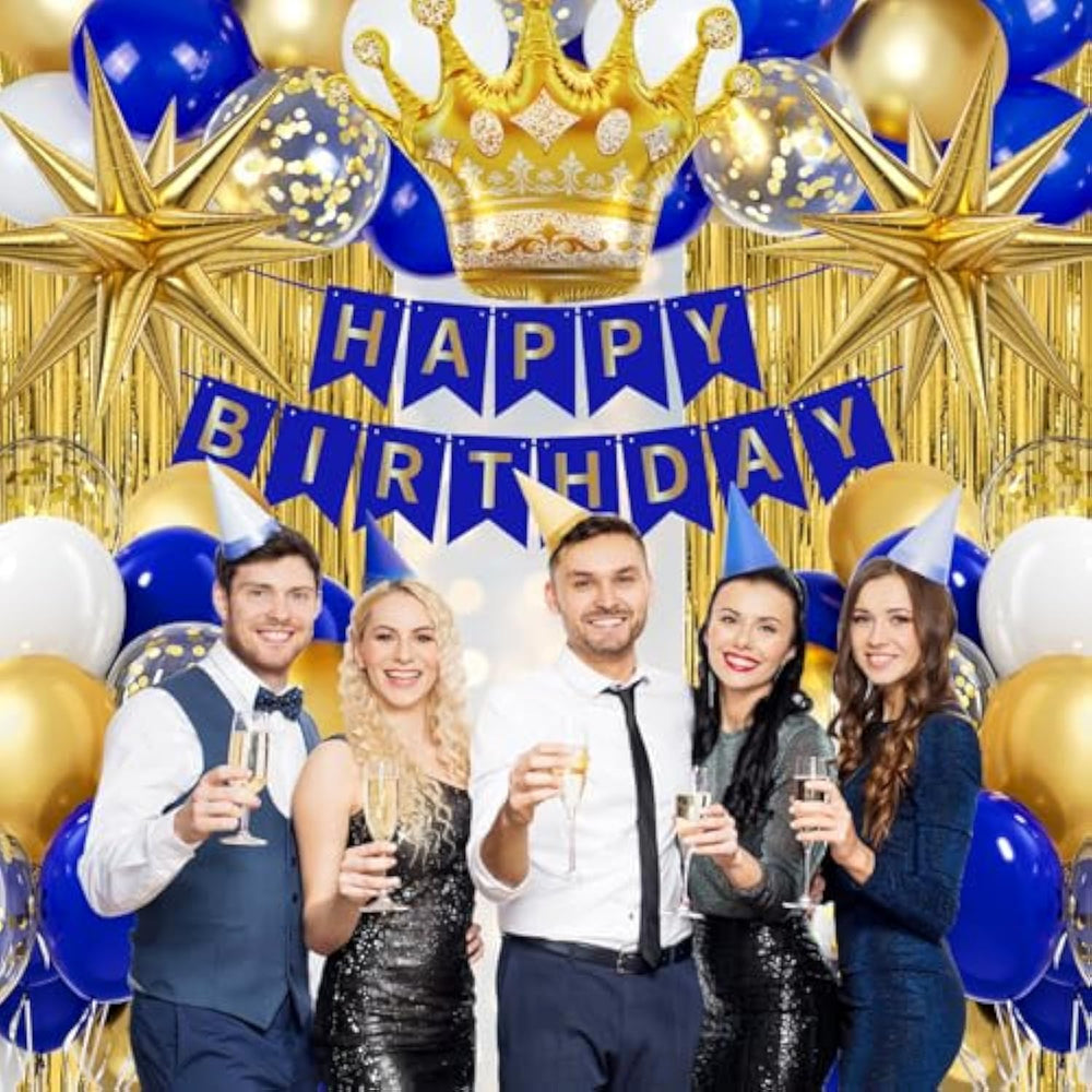 Package Included: The Blue Happy Birthday Decorations Kit Include 10Inch Royal Blue Balloons X15, 10Inch White Balloons X10, 10Inch Metallic Gold Balloons X10, 12Inch Gold Confetti Balloons X3, Happy Birthday Banner X1, Foil Balloons X3, Metallic Gold Fringe Curtains X1, Glue Dots X60, Blue Ribbonx1 | Full Birthday Decoration Set: The All-Inclusive Blue Birthday Decorations Kit Includes A Happy Birthday Banner, Fringe Curtains, And Balloons. Great For Creating A Backdrop Or Photo Booth For Celebrations | Easy To Use: The Blue And Gold Birthday Decorations Bring Charm To Your Party, Creating Unforgettable Memories. The Birthday Decorations For Men Includes Glue Dots And Ribbons For Easy Balloon Arch Setup. Hang Banners And Balloons On Walls, Windows, Or Any Indoor Or Outdoor Space You Like | Suitable Occasion: The Blue Gold And White Birthday Party Decorations Kit Is Great For Many Happy Birthday Decorations, That Include Blue Birthday Decorations For Men, Can Be Used As 16Th, 18Th, 21St, 25Th, 30Th, 40Th, 50Th, 60Th, 70Th Birthday Party Decorations | Warm Tips: If There Are Any Issue With The Men Birthday Decorations Set, We Will Work Hard To Solve Them Until You Are Satisfied |