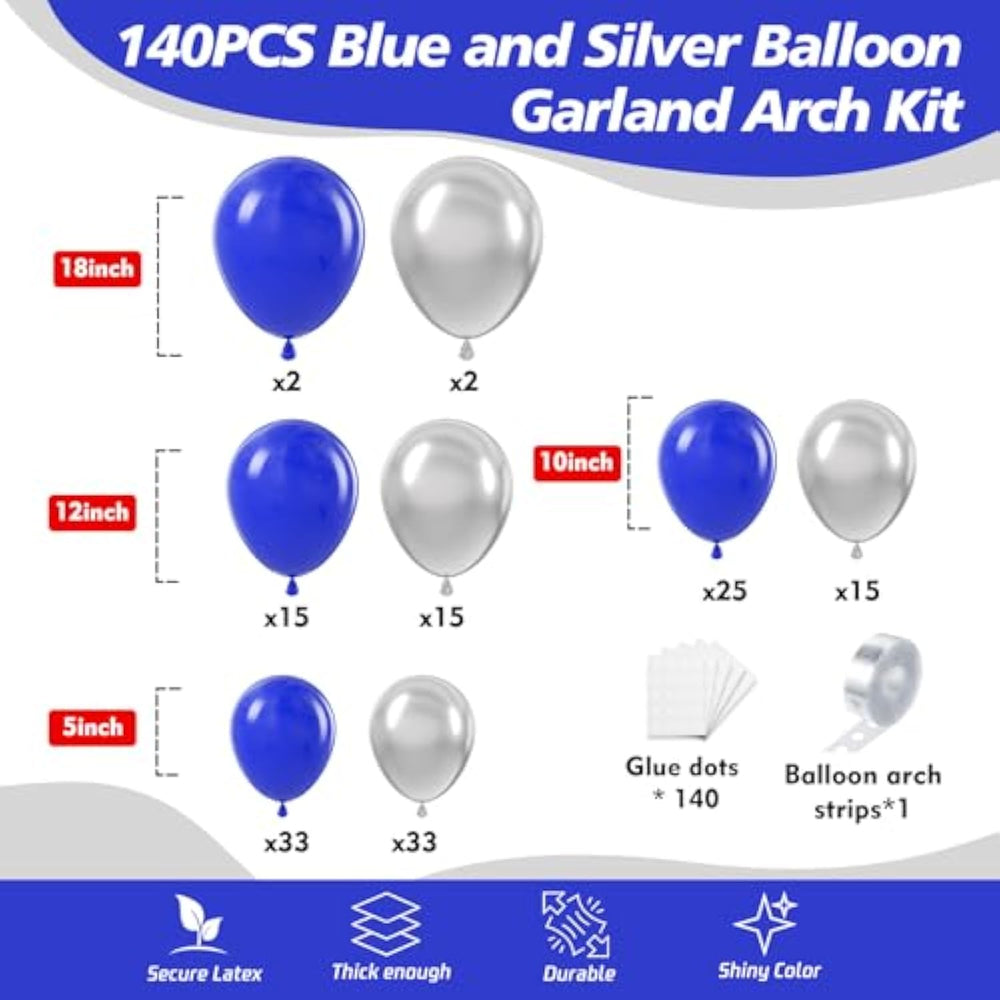 The Blue and Silver Balloon Arch Kit includes 140 pieces of balloons in royal blue and metallic silver, with sizes ranging from 5" to 18". This set also includes 20 glue dots and a balloon garland strip. Perfect for a variety of events, including graduation parties (Class of 2024/2025), birthdays, weddings, anniversaries, and more, this kit adds a festive touch to any celebration. Made from eco-friendly, natural latex, the balloons are durable, elastic, and safe for kids, with a longer-lasting effect when inflated with air or helium. Assembly is simple with the included tools: balloon strip and glue dots. An electric balloon pump is recommended for quick inflation.