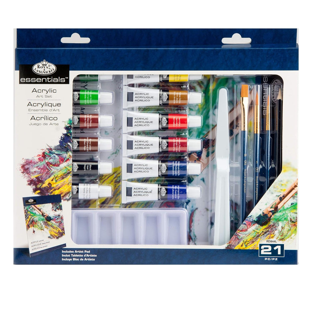 | Essentials brand fine art acrylic paints and painting tools | | Ideal starter set that includes artist's acrylic painting pad | | Set includes: 12 acrylic paint tubes (12ml), 3 gold taklon brushes, 1 palette knife, 1 six well palette, 1 graphite pencil, 1 pencil sharpener, 1 white eraser, 1 acrylic artist pad (9 in x 12 in) | | Product Dimension: 9.5"L x 13.3"W x 1.0"H | |