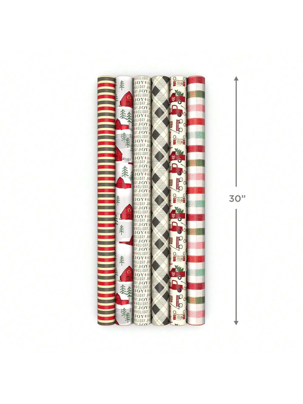 Pack includes 6 holiday wrapping paper rolls in assorted designs: faded red and black stripes, black and cream plaid, snow-covered barns, antique red trucks, "Holiday Joy" on cream, and fuzzy flannel check.