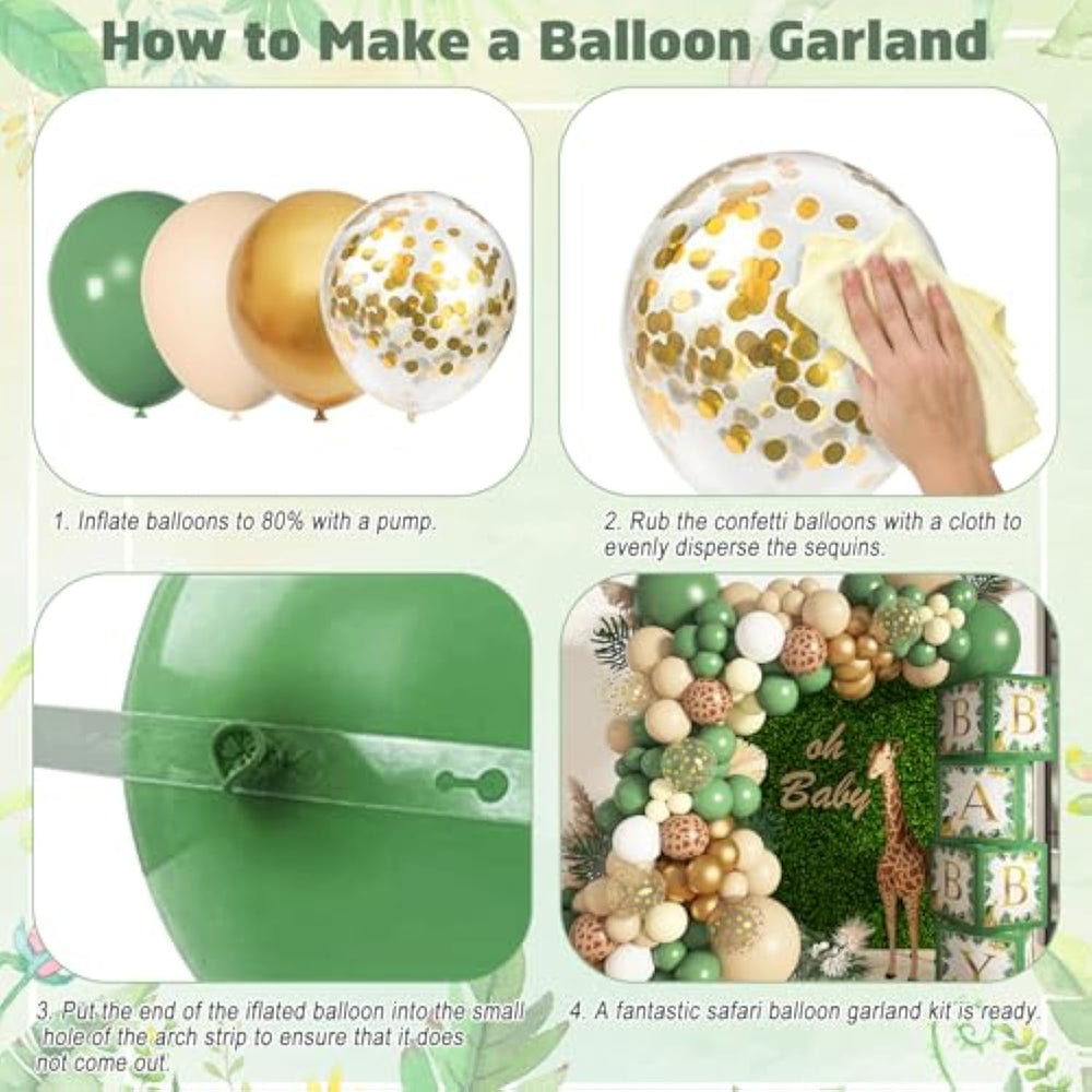 Create a stunning safari-themed celebration with this all-in-one jungle baby shower decoration set. It includes 4 sage green baby boxes with gold letters, giraffe print balloons, metallic gold, nude, white, and sage green balloons in various sizes, plus confetti balloons and balloon tools for easy setup. The vibrant colors and high-quality materials make it perfect for baby showers, wild one birthdays, or jungle-themed parties. Easy to assemble and beautifully designed, this kit adds a bold and playful touch to any event—sure to impress guests and delight kids!