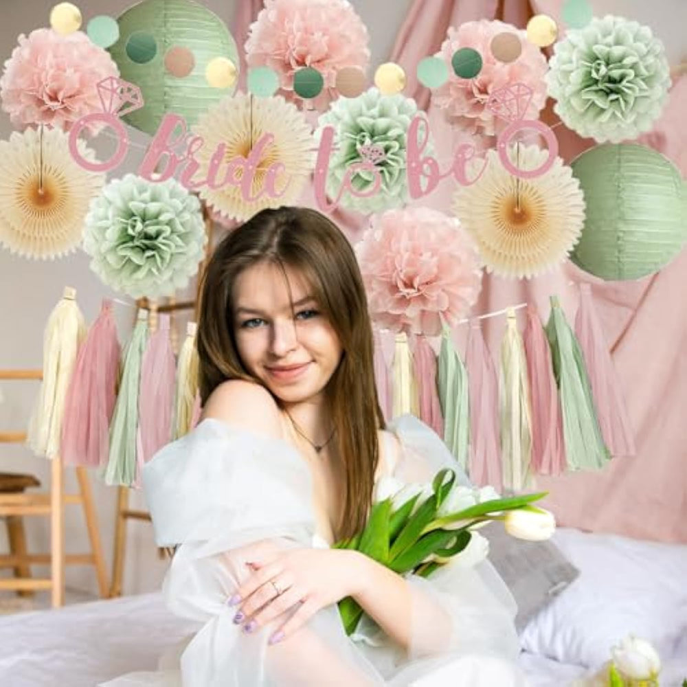| ?Sage Green And Blush Pink Bridal Shower Decorations Kit? 3Pcs Beige Paper Fans Decorations, 7Pcs Sage Green And Blush Pink Tissue Paper Pom Poms, 2Pcs Sage Green Paper Lanterns, 1Pc Bride To Be Rose Gold, 1Pc Paper Garland Circle Dots, 20Pcs Dusty Pink Green Beige Tassel Garland | | ?Diy Joy? In Order To Avoid Any Possible Damage During Transportation, This Sage Green And Pink Bridal Shower Decorations Set Is Packed Flat. You Could Decorate Your Bridal Shower Party With Your Family Or Friends To Enjoy A Happy Time Together. | | ?Unique? This Sage Green And Pink Bachelorette Party Decorations Kit Is Super Cool, You Could Use It Anywhere According To Your Need And Your Preference | | ?Material? Paper Fans, Paper Pom Pom Flowers, Paper Lanterns And Tassel Garlands Are Super Light And Fun To Use. | | ?Satisfaction? If The Bridal Shower Decorations Sage Green And Dusty Rose Set You Received Is Defective Or You Just Don'T Like It, Please