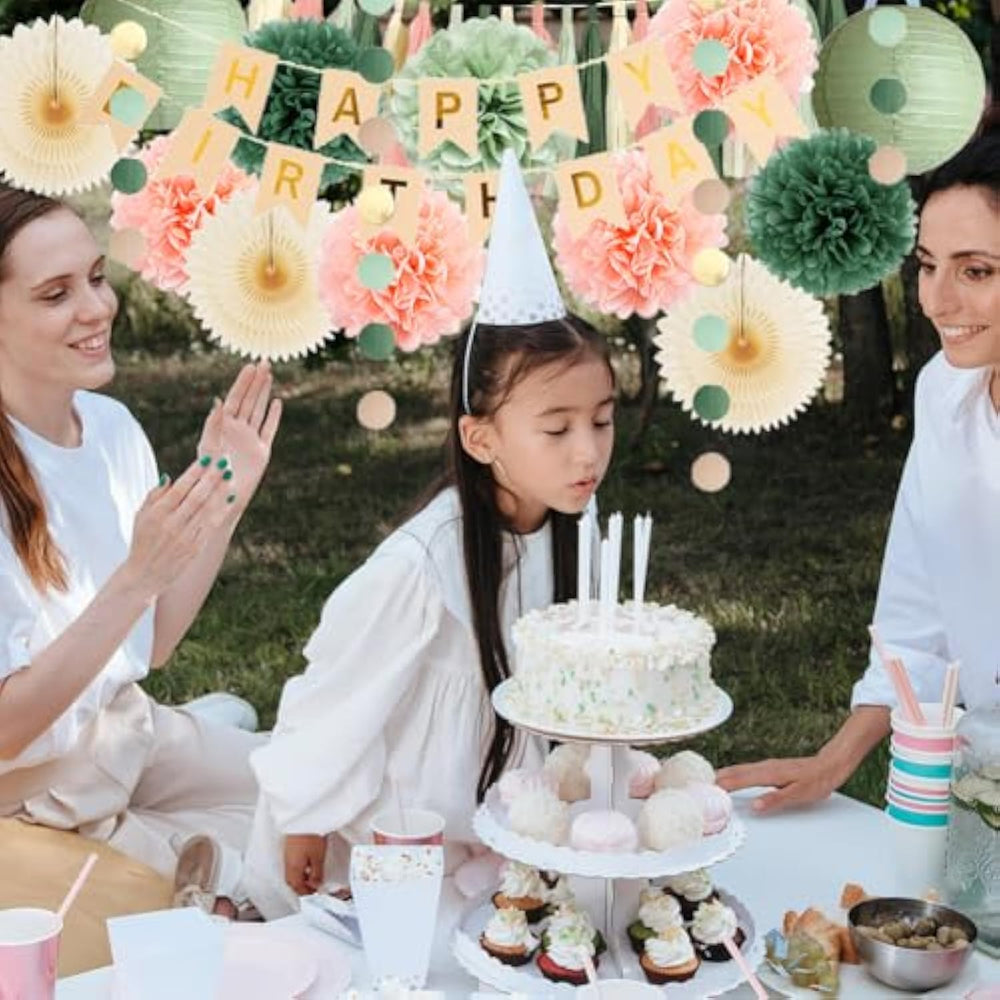 | ?Sage Green And Peach Birthday Decorations Kit? 3Pcs Beige Paper Fans Decorations, 7Pcs Tissue Paper Pom Poms Olive Sage Green And Peach, 2Pcs Sage Green Paper Lanterns, 1Pc Happy Birthday Banner Beige Gold, 1Pc Paper Garland Circle Dots, 20Pcs Peach Pink Green Beige Tassel Garland | | ?Diy Joy? In Order To Avoid Any Possible Damage During Transportation, This Peach Sage Green Birthday Decorations Retro Green Set Is Packed Flat. You Could Decorate Your Birthday Party With Your Family Or Friends To Enjoy A Happy Time Together. | | ?Unique? This Birthday Decorations Green And Peach Kit Is Super Cool, You Could Use It Anywhere According To Your Need And Your Preference | | ?Material? Paper Fans, Paper Pom Pom Flowers, Paper Lanterns And Tassel Garlands Are Super Light And Fun To Use. | | ?Satisfaction? If The Boho Sage Green Peach Birthday Party Decorations Set You Received Is Defective Or You Just Don'T Like It, Please