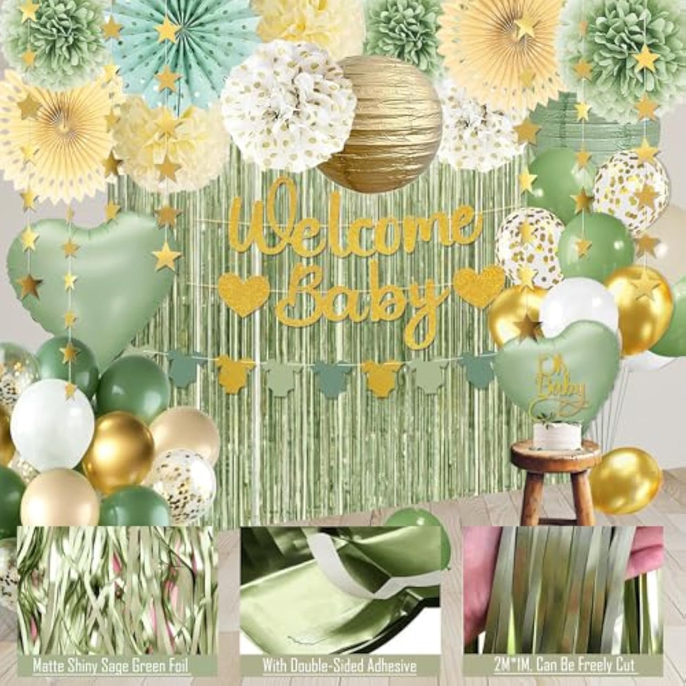 | Complete Baby Shower Set: This All-In-One Decoration Kit Includes 42+ Pieces To Help You Create An Unforgettable Baby Shower Celebration. It Features A "Welcome Baby" Banner, Baby Onesie Garland, Glitter "Oh Baby" Cake Topper, And More, Making It Perfect For Any Baby-Themed Party. | | Elegant Sage Green Gold Theme: The Combination Of Sage Green And Gold Balloons, Tissue Pom Poms, And Paper Flower Fans Creates A Sophisticated And Elegant Atmosphere For Your Event. Ideal For Welcoming Your Little One With Style And Charm. | | 15-Minute Party Transformation?Even If It'S Your First Time Setting Up A Party, You Can Do It With Ease! All Pieces Include Simple Hanging Guides. No Professional Experience Is Required To Quickly Set Up And Enjoy A Stress-Free Party Decoration Process. | | Versatile Decoration Options: Whether You'Re Decorating The Party Venue, Cake Table, Or Photo Booth, This Kit Offers Various Elements Like Paper Lanterns, Star Garlands, And Balloon Arrangements To Add A Festive Touch To Every Corner. | | Perfect After-Sales Service: We Are Committed To Providing High-Quality Products And Service. If You Have Any Questions About This Set, Our