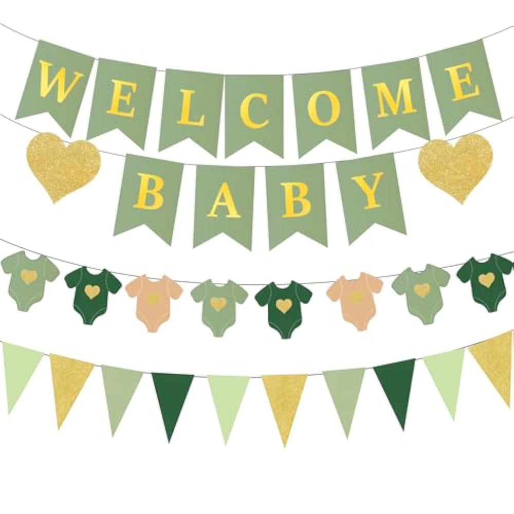 | Package:Include 4Pcs 8.2 Feet Banners,Welcome Baby Banners,1Pc Short-Sleeve Bodysuit Banner,1Pc Pennant Banner,Add Great Festivity To Neutral Baby Shower And Gender Reveal Party | | Pre-Assembled: Sage Green And Gold Baby Shower Banners Kit Are Assembled In Advance,So You Don'T Need To Diy It By Yourself,Which Can Save Your Time And Effort During The Process Of Party Preparation | | Sturdy Material: Our Welcome Baby Shower Banner Decorations Are Made Of Sturdy Quality Cardstock Paper With Glitter Heart, Sturdy And Reusable,Fetured With Beautiful Colors | | Neutral Gender Reveal Baby Shower Decorations:The Colors And Prints Are Very Clear And Vibrant,Which Will Create An Amazing Atmosphere.This Set Will Give You Everything You Need To Celebrate Your Baby Shower Party Or Gender Reveal Party | | Wide Applications: The Sage Green Neutral Baby Shower Decorations Kit Can Be Hung On Bulletin Board,Gardens, Walls, Windows, Doors,Ceiling | |