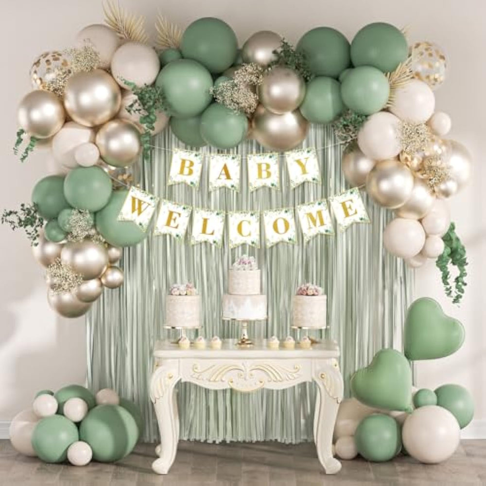 What You Receive: The Sage Green Baby Shower Decorations Kit Includes 15Pcs Sage Green Balloons(10Inch X10, 5Inch X5), 15Pcs Sand White Balloons(10Inch X10, 5Inch X5), 15Pcs Gold Balloons(10Inch X10, 5Inch X5), 12Inch Gold Confetti Balloons X5, Light Green Fringe Curtains X1, Welcome Baby Sage Green Banner X1, Sage Green Heart Foil Balloons X2, Glue Dots X1, Green Ribbon X1, Decorative Strip X1 | All Inclusive Baby Shower Decorations: The Gender Neutral Baby Shower Decorations Set Is An All Inclusive Package Featuring Balloons, Baby Shower Banner, Fringe Curtains, And A Variety Of Foil Balloons,Great For Creating A Backdrop Or Photo Booth For Baby Shower Decorations Boy | Easy To Use: Boho Boy Baby Shower Decorations Bring Charm To Your Party, Creating Unforgettable Memories. The Sage Green Baby Shower Decor Includes Glue Dots And Ribbons For Easy Balloon Arch Setup. Hang Banners Balloons And Fringe Curtains On Walls, Windows, Or Any Indoor Or Outdoor Space You Like | Widely Applications: The Sage Green Party Decorations Set Is Great For Many Occasion, That Include Oh Baby Baby Shower Decorations For Boy, Boho Baby Shower Decorations,Baby Shower Decorations Neutral?Safari Baby Shower Decorations, Woodland Baby Shower Decorations, Gender Reveal Party Decorations | Warm Tips: If There Are Any Problems With The Neutral Baby Shower Decorations, We Will Try To Solve Them For You, So That You Can Enjoy The Party With Peace Of Mind |
