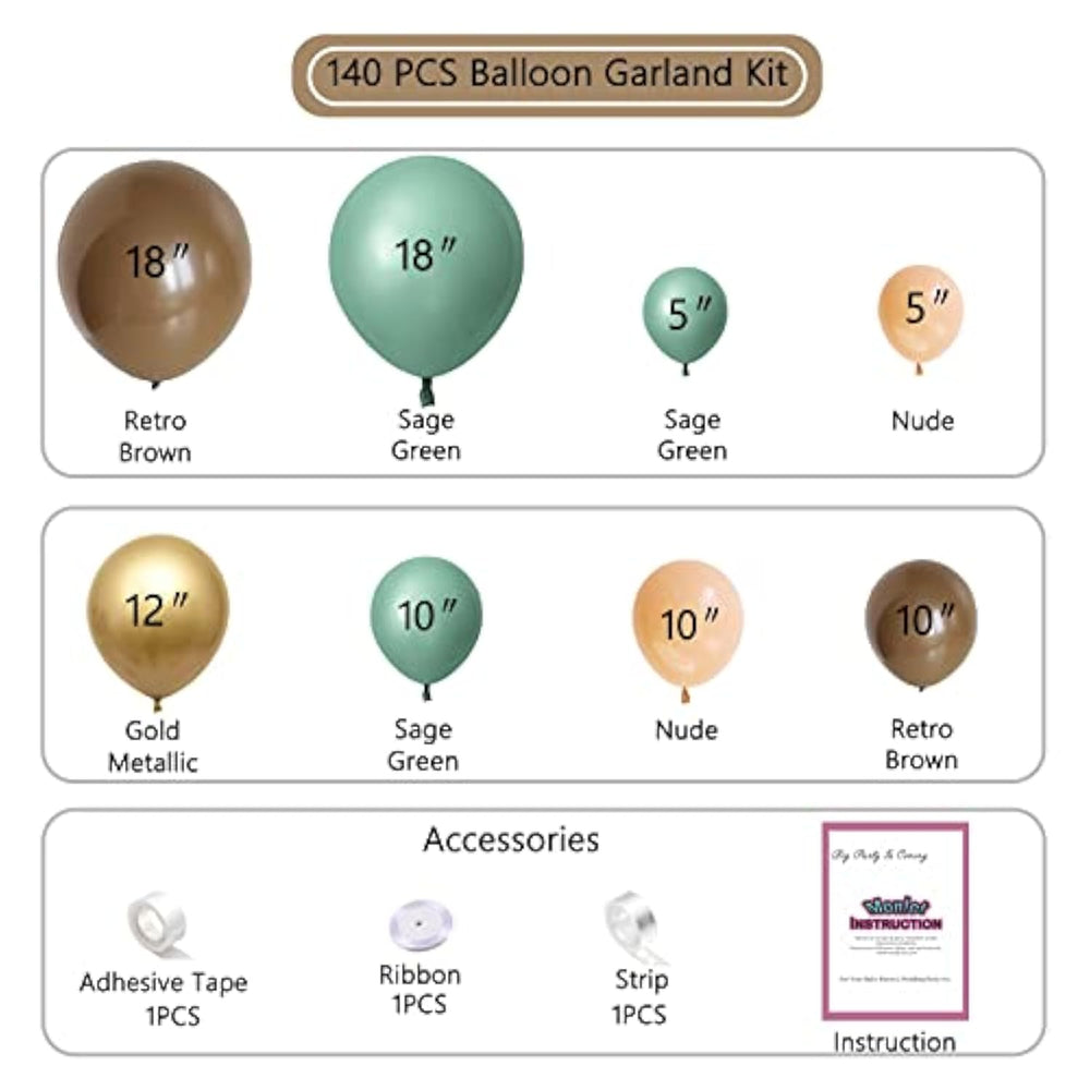 This brown and green balloon garland kit includes 135 balloons in assorted sizes, featuring retro brown, olive green, chrome gold, retro coffee, beige, nude, and avocado green, along with decorating strip, tape, ribbon, and instructions. Easy to assemble by securing balloons of different sizes to the strip and filling gaps with smaller balloons, it’s perfect for creating woodland or mountain-themed arches for baby showers, weddings, birthdays, anniversaries, photo shoots, and other celebrations.