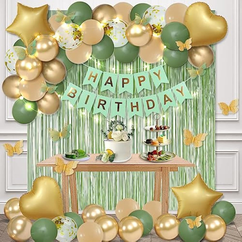 Birthday Party Decoration:This Birthday Decoration Set Includes Everything You Need: Banner, Balloons, Curtains, Led Lights And All Kinds Of Tools. There Are Also 6 Themed Colors Can Be Choose. And All You Need Is 2 Aa Batteries To Get Your Birthday Party | Package Including:1Pcs Happy Birthday Banner, 2Pcs 3.3Ft * 6.6Ft Foil Curtains, 12Pcs Paper Butterfly, 2Pcs 18Inch Gold Star, 2Pcs 18Inch Gold Heart, 40Pcs 10Inch Latex Balloons (Green, Gold, Apricot), 5Pcs 12Inch Confetti Balloons, 1Pcs 9.8Ft Led Lights, 1Pcs Balloon Chain, 1Pcs Glue Dot,1Pcs Straw, 1Pcs Ribbon | About Materils: The Party Supplies Are Made Of Friendly Materials. The Balloons Are Ong-Lasting And Colorful | Easy To Assembly:The Set Come With Balloon Chain, Dot Glue, Ribbon And Straw. These Tools Can Be Used To Inflate The Balloon And Set Up The Birthday Party Venue Quickly. Take More Beautiful Photos, It'Ll Be A Great Party Memories For You | Occasion: Suitable For All Kinds Of Parties, Room Decoration, Celebrations |