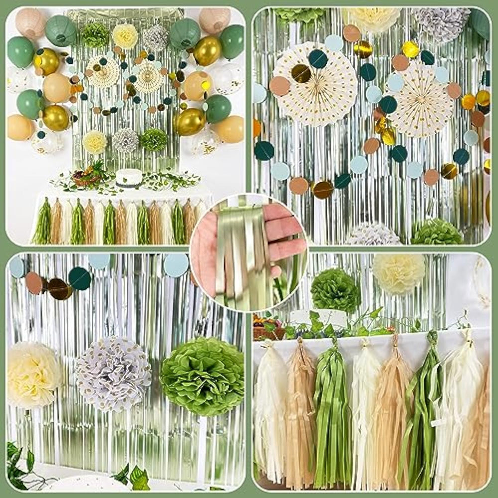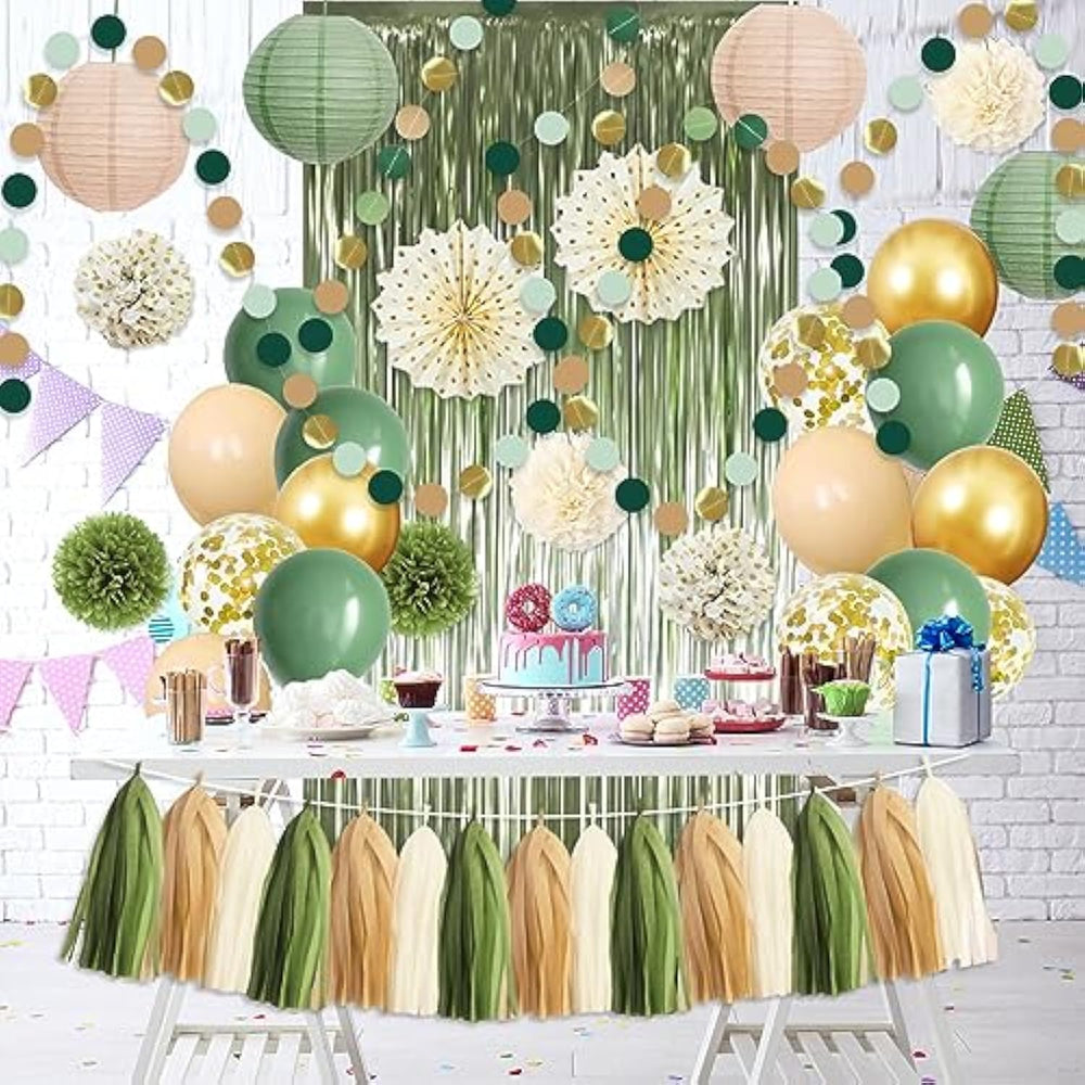 Create a stunning atmosphere with this 45-piece Sage Green & Gold Party Decoration Kit, featuring balloons, paper pompoms, tassels, lanterns, fans, garland, and a fringe curtain. Easy to assemble with no experience needed, the decorations can be hung on walls, ceilings, windows, or tables. Perfect for weddings, birthdays, baby showers, bridal showers, and more, this eco-friendly, reusable set adds a stylish and elegant touch to any celebration.