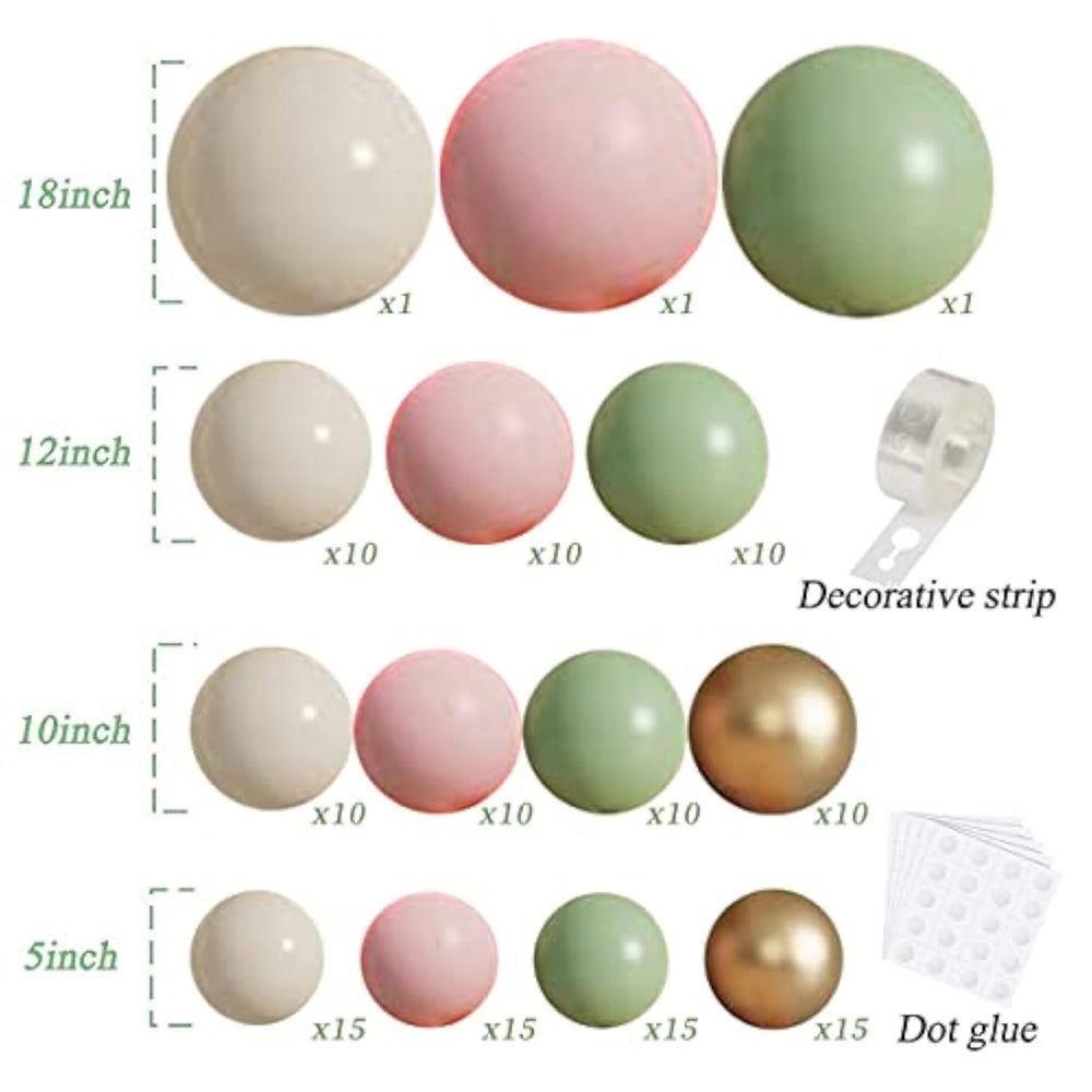 ?Sage Green Balloon Garland?This Sage Olive Green Balloons Garland Kit Including: 133Pcs,There Has 18Inch, 12Inch,10Inch And 5Inch Size Balloons,There Has: 36 Pcs Sage Green Balloons,36 Pcs Macaron Pink Balloons,36 Pcs Sand White Balloons And 25 Pcs Metallic Gold Balloons.The Balloon Garland Accessories Kit Including:1 Pcs Strip Tape,5 Pcs Glue Points. | ?Premium Quality?These Sage Green Blush Pink Balloons Are Made Of Durable And Sturdy Latex,Harmless And Odorless.These Blush Balloons Can Be Filled With Air And Helium. | ?Easy Assembly?This Blush Pink Peach Balloon Garland Kit Is Easy To Inflate,You Could Inflate The Balloons And Assemble Them Together In The Style You Want.You Can Hang Them On Trees,Walls,Doorways Or Wherever You Like. | ?Wide Application?The Retro Matte Olive Green Balloon Garland Kit Perfect For Graduations,St Patricks Day, Engagements, Weddings, Anniversaries,Girl Baby Showers, Jungle Woodland Safari Theme Party,Wild One 1St Birthday Party And So On.Perfect Party Decorations For Adding Romantic And Festive Atmosphere. | ?Note?Please Do Not Inflate The Avocado Green Gold Birthday Balloons More Than 90% To Avoid Sudden Popping. Also You Should Pay Attention To Avoid High Temperature, Sharp Objects And Friction.Discard Broken Party Balloons At Once.If You Are Not Satisfied With Our Safari Balloon Garland Kit, Just Tell Us And We Will Refund You Unconditionally In Full. |