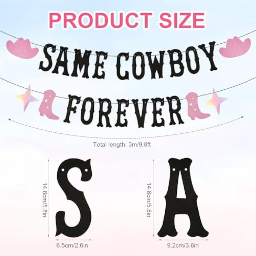| Package Includes: You Will Receive 1 Piece Of "Same Cowboy" Banner And 1 Piece Of "Forever" Banner To Meet Your Decoration Needs. | | Product Material: The Rodeo Banner Is Made Of Premium Paper, Sturdy, Not Easy To Break And Fade, You Can Use It With Confidence. | | Product Design: Our Party Decoration Banners Are Paired With Pink Cowboy Hats, High Heels And Other Decorations, With Cute Shapes And Beautiful Fonts To Better Decorate Your Party. | | Easy To Use: Our Banners Are Pre-Strung On Two Ropes, So You Can Hang It Wherever You Want To Decorate Without Having To Assemble It Yourself. | | Suitable Size: The Total Length Of This Banner Is 3M/9.8Ft, A Perfect Size For A Rodeo Bachelor Party, Western Bridal Shower, Engagement Party, Etc. | |