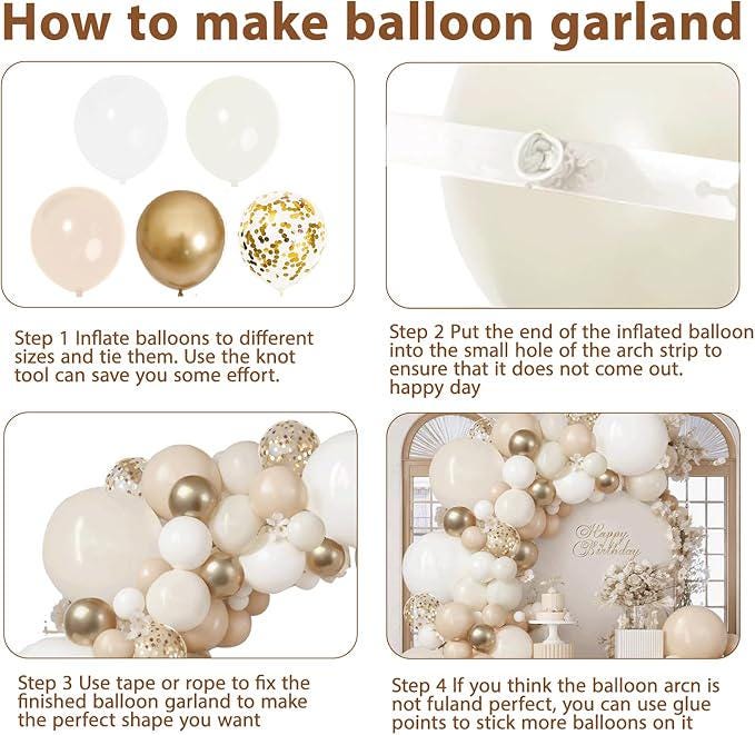 This sand white and gold balloon set includes 134 high-quality balloons in various sizes and colors, including sand white, white, light smoke, chrome gold, and gold confetti, along with a decorative strip and five balloon stickers for easy assembly. Made from durable natural latex, the balloons are tougher than standard options and stay inflated for long-lasting, elegant decorations. Ideal for weddings, engagements, bridal showers, birthdays, anniversaries, and other celebrations, the neutral boho colors create a sophisticated and versatile atmosphere that pairs well with many themes. For confetti balloons, inflate first, then shake and gently rub on a dry surface to help the confetti stick. To maintain the balloons, avoid high heat, sharp objects, and excessive friction.