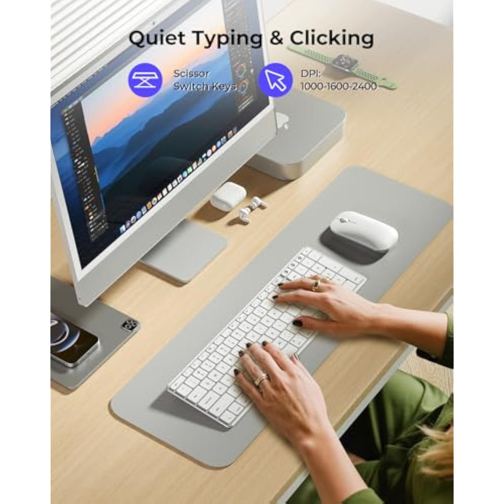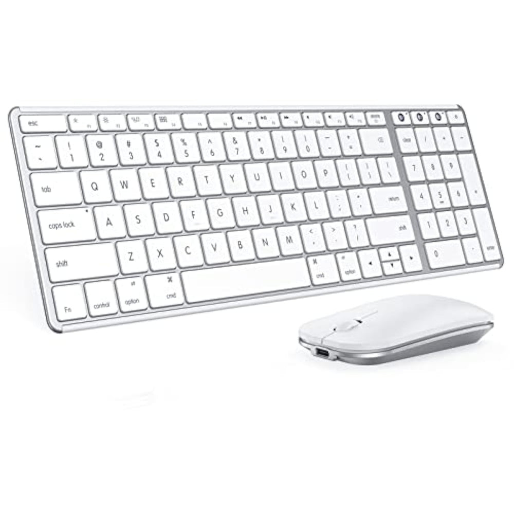 | Perfect for Apple Users: The Bluetooth keyboard and mouse is designed for Mac users with a standard apple layout. With advanced BT1/BT2/BT3 modes, this combo allows you to easily type across three devices, perfect for your Mac, MacBook Pro/Air, iPad | | Type-C Rechargeable Battery: Say goodbye to constantly changing batteries! Our combo features Type-C rechargeability, it provides an standby time of up to 200 hours. Auto-sleep mode and on/off design also keep a low consumption | | Whispered-Quiet Typing and Clicking: With increased key stability to reduce noise and optimize responsiveness, the wireless keyboard and mouse give you that satisfying “click” feel, but not to hear it, perfect for those who are productivity-focused | | Slim Metalic Appearance: Ultra-thin design with only 0.12 in for keyboard and 0.9 in for mouse, which is easy to slip into your bag. The combo are made from stainless steel and premium ABS materials, making them a beautiful decoration on your desktop | | Wide Compatibility Tips: Compatible with Mac OS 10.12 or above, iPad OS 13.0 or above, and iOS 13.0 or above | |