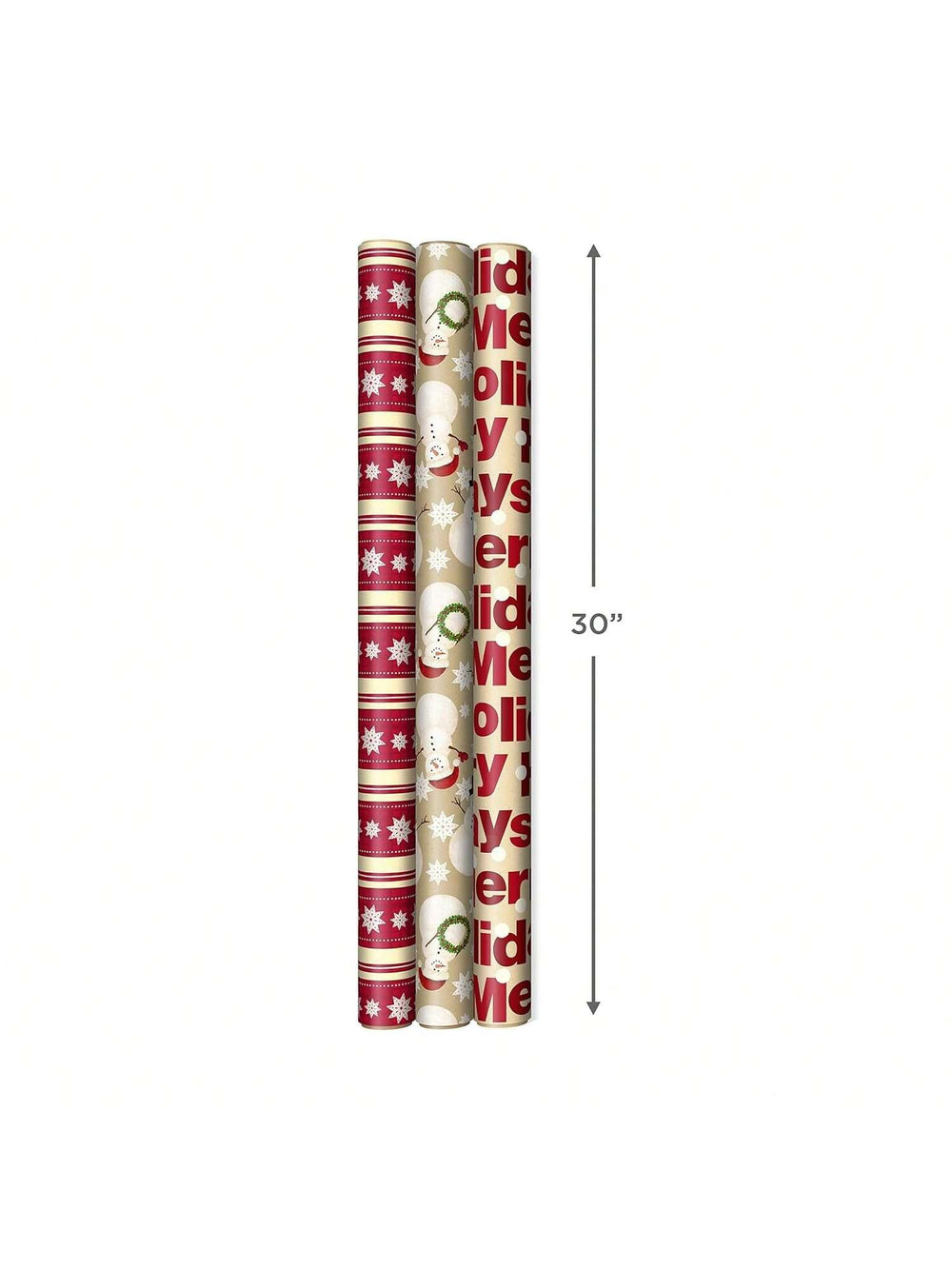 Pack includes 3 reversible holiday wrapping paper rolls in assorted kraft paper designs: red polka dots/snowflake stripes, white snowflakes/snowmen collage, "Merry Holidays" messages/red stripes.