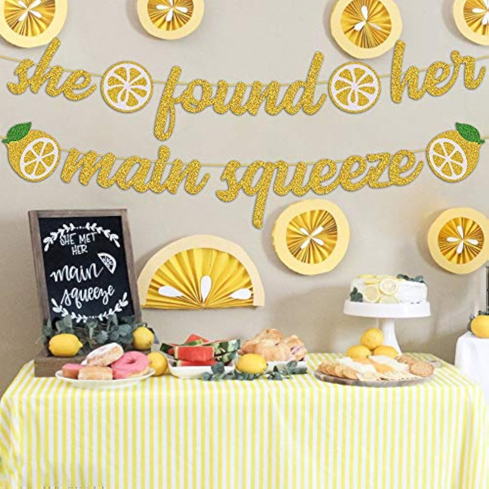 | Lemon Bridal Shower Decorations: You Will Get 2 Separate Banner In Package: "She Found Her" And "Main Squeeze"Sign With Two Cute Lemon Pattern.Perfect For Bridal Shower, Bride To Be, Bachelorette Party, Hen Party, Engagement Party, Wedding Party, Valentine'S Day Party,Final Fiesta Party, Etc. | | Excellent Material: The Bridal Shower Banner Is Made Of Thick Glitter Gold Cardstock.The Lemon Banner Wll Not Shed Or Fall Off, It Will Be A Great Addition For Your Party. | | Great Size: "She Found Her" Letter Is Approx. 57 Inches And "Main Squeeze" Letter Is Approx. 55 Inches In Length. Bachelorette Party Banner Will Stand Out And Make Your Party More Sparkling, Gold Ribbon Allows You To Adjust The Banner For Any Place. | | Pre-Strung: Whole Banner Is Pre-Assemble, All You Need To Do Is Open The Package And Start Decorating Your Party. You Can Easily Decorate Them On The Wall, Window, Party Table, Mantels, Tree, Garden And So On. A Good Match Of Banners Will Create An Instant Party Atmosphere. Get Creative With Your Diy Party Ideas And Leave Beautiful Memories With Our Amazing Bridal Shower Banner! | | "