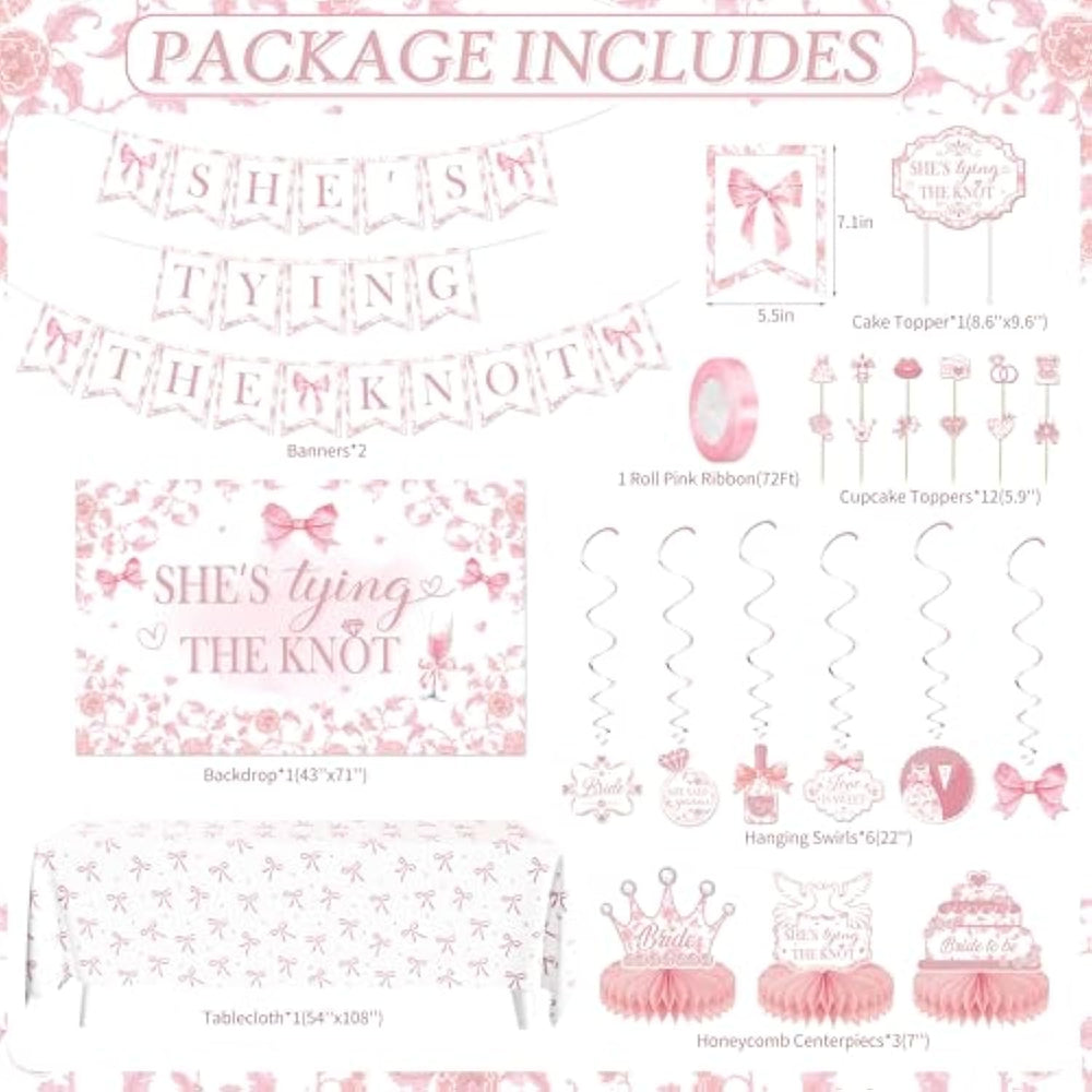 | Bridal Shower Decor Kit?You Will Receive 80 Latex Balloons, 8 Long Balloons, 2 Bow Shaped Foil Balloons, 1 Heart Foil Balloons, 1 Star Foil Balloons, 1 "She'S Tying The Knot" Backdrop, 1 Tablecloth, 1 Big Cake Topper, 12 Cupcake Toppers, 1 Set Banners, 1 Roll Of 72Ft Ribbon, 6 Swirl Streamers With 6 Printed Cards, 3 Honeycomb Centerpieces And 3 Balloon Tools | | Reliable Materials: Pink Bow Banners, Cake Decorations And Honeycomb Centerpieces Are Made Of High Quality Cardstock, Printed Clearly And Do Not Fade Easily. The Disposable Plastic Tablecloth Is Smooth And Waterproof, Suitable For Party Use. Vinyl Backdrop, Wear-Resistant | | Easy Decoration: Our Packaging Includes Balloon Chains, Glue Dots And Ribbons, Which Will Help You Make A Beautiful Balloon Arch Easier. The Pink Bow Background Has Holes In The Corners And Comes With Ribbon (Cut To The Desired Length) For Easy Hanging. Simply Set Up To Get A Beautiful Bridal Themed Party | | Elegant Design: Glamorize The Party With A Variety Of Chic Bow Elements Combined With Pink Flowers, Ready To Celebrate In Style And Set The Perfect Tone For An Unforgettable Pre-Wedding Party | | Wide Application: Suitable For Bridal Showers, Weddings, Bow Parties, Bachelorette Parties And Any Party You Want! A Pink Bow Decorating Kit Will Brighten Up Your Party | |