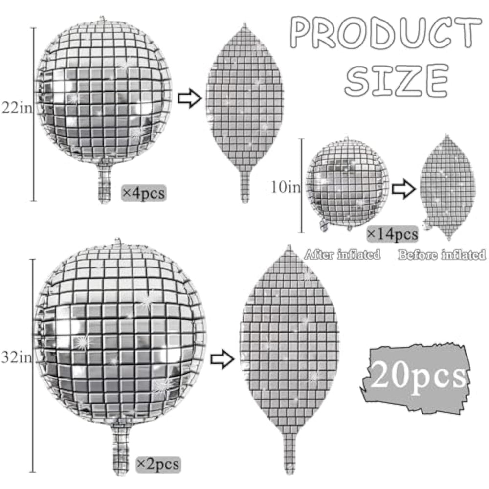 This 20-piece disco balloon set includes metallic silver foil balloons in assorted sizes: 2 giant 32", 4 medium 22", and 14 small 10" balls. Designed to mimic real disco balls with a smooth, reflective finish, they add shine and texture to any event. Made from durable Mylar, these balloons hold helium well, are easy to inflate with a pump or straw, and feature a self-sealing design for quick setup. Perfect for 70s or 80s themed parties, birthdays, weddings, bachelorette events, or New Year’s Eve celebrations. Reusable and sure to make a dazzling statement.