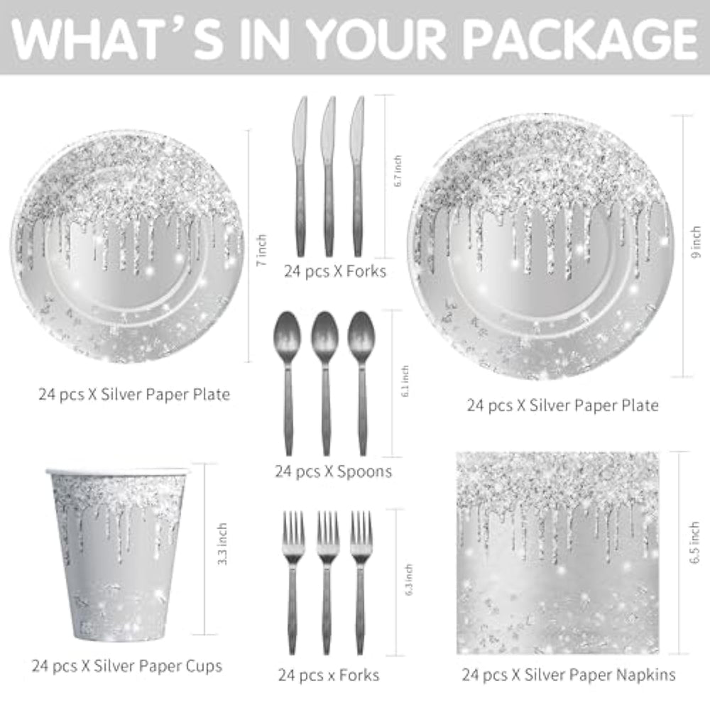 | ?Silver Birthday Decorations?Featuring A Sophisticated Combination Of Glitter Diamonds And Silver Hues, This Diamond Silver Birthday Party Supplies Tableware Set Adds A Touch Of Elegance And Luxury To Any Event, Creating A Chic And Modern Look | | ?Complete Party Solution?Silver Glitter Birthday Party Supplies Dinnerware Included 24Pcs 9'' Silver Glitter Dinner Plates, 24Pcs 7'' Silver Dessert Plates, 24Pcs Paper Napkins, 24Pcs Party Cups, 24 Sets Of Disposable Cutlery, For Silver Bridal Shower Decorations Party Supplies | | ?Premium Quality Materials?Crafted From High-Quality Materials, These Silver Diamond Party Supplies Dinnerware Are Not Just About Looks β They Are Reliable. Nice Plates And Cups Ensure That Your Guests Can Enjoy Their Meals Without Worry, While The Napkins Add A Touch Of Elegance To The Overall Presentation | | ?Versatile Usage?Ideal For Birthdays, Anniversaries, Retirement, Weddings, Graduation, Baby Showers, Or Any Special Occasion, This Versatile Tableware Set Adds A Touch Of Elegance To Any Event. The Timeless Glitter Silver Color Scheme Suits Casual Gatherings And Formal Celebrations | | ?Easy To Cleanup?Hosting A Stress-Free Party Is Now Possible With The Disposable Nature Of The Diamonds And Silver Birthday Party Decorations Tableware Set. After The Festivities, Simply Gather And Dispose Of The Used Items, Making Cleanup A Breeze. Spend More Time Enjoying The Party And Less Time On Post-Event Chores | |