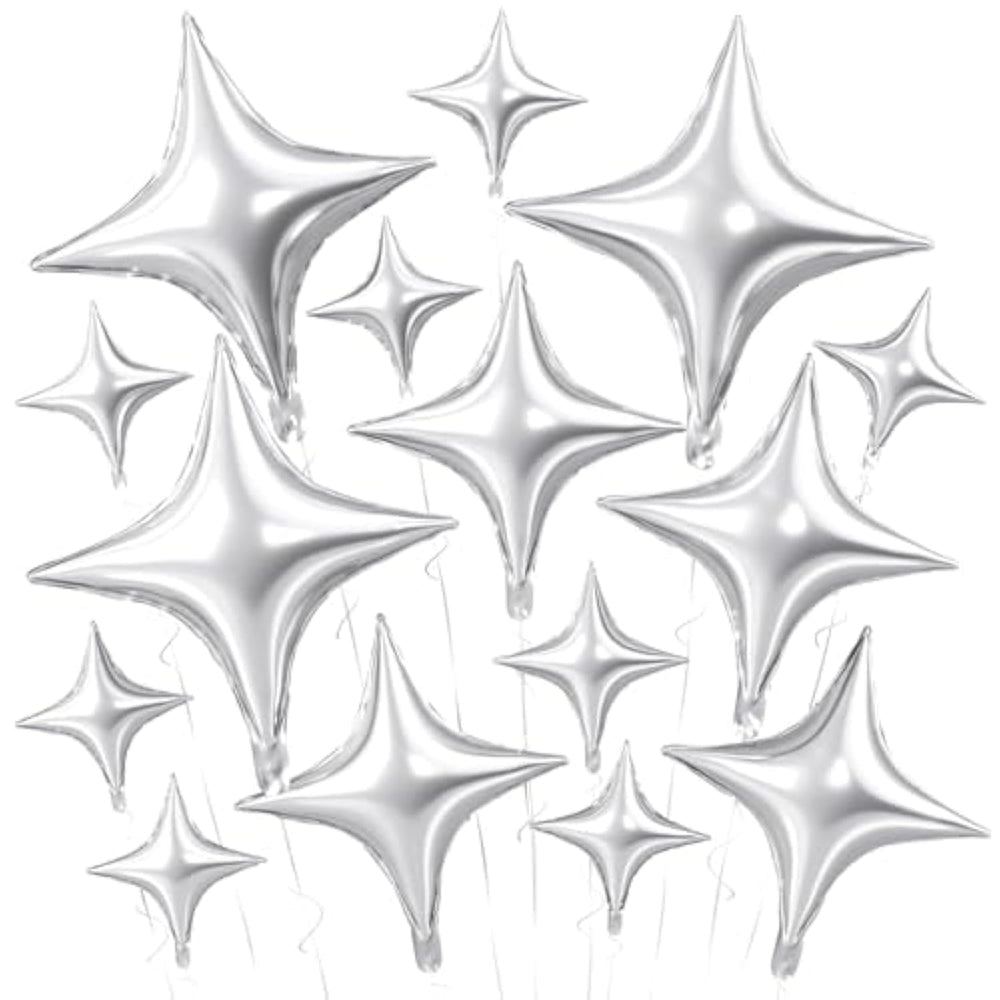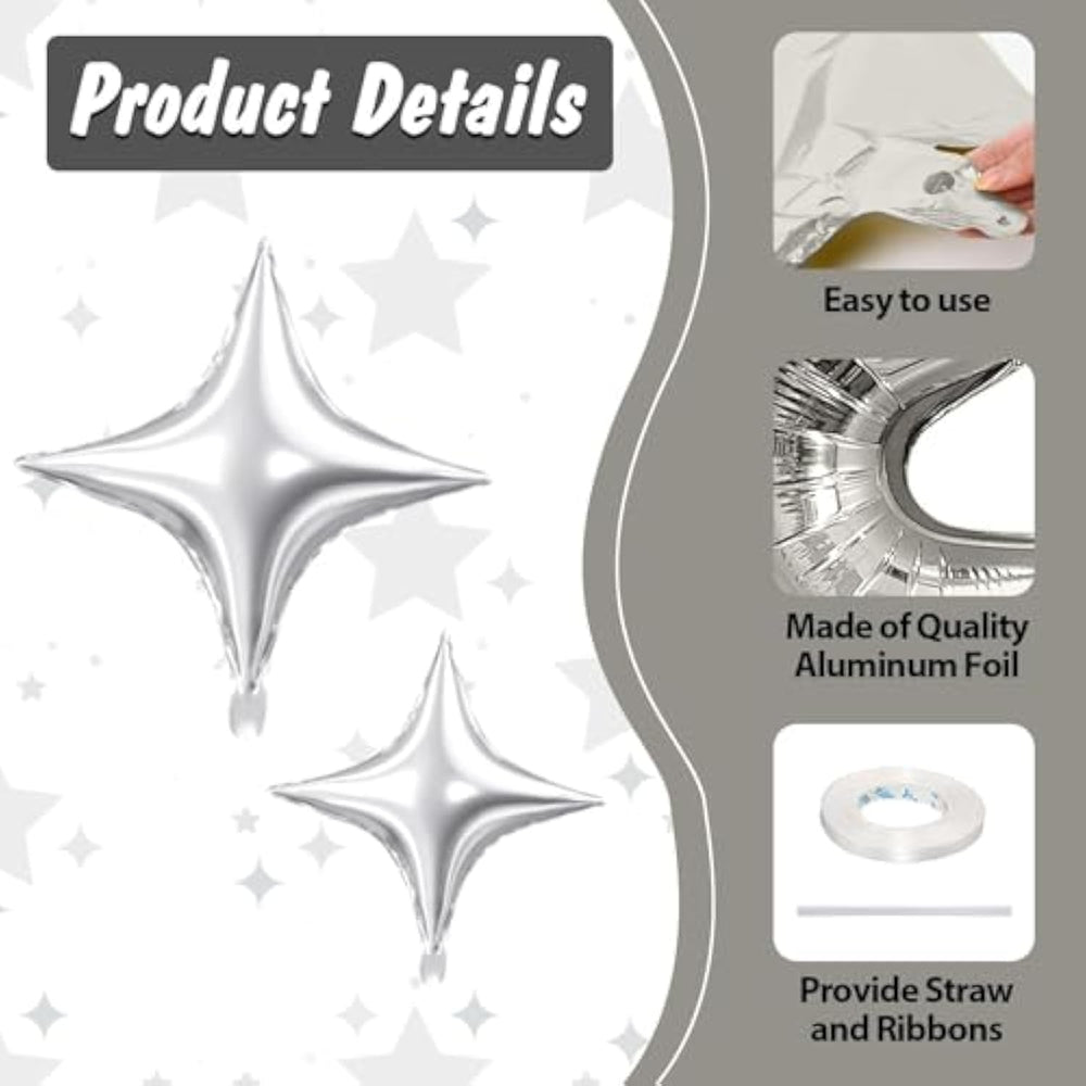 | ?15Pcs Silver Star Balloons Set?This Festive Set Of Silver Star Balloons Includes 3× 26-Inch Silver Four Pointed Star Aluminum Foil Balloons, 4×18-Inch Silver Foil Star Balloons, And 8×10-Inch Silver Star Foil Balloons. A Straw And A White Ribbon Are Included For Easy Inflation And Decoration, Adding Sparkle And Charm To Any Celebration. | | ?Premium Materials?Crafted From Reliable, Safe Aluminum Film,Aluminum Film, Our Star Balloons Are Designed To Last. These Four-Angle Silver Balloons Automati