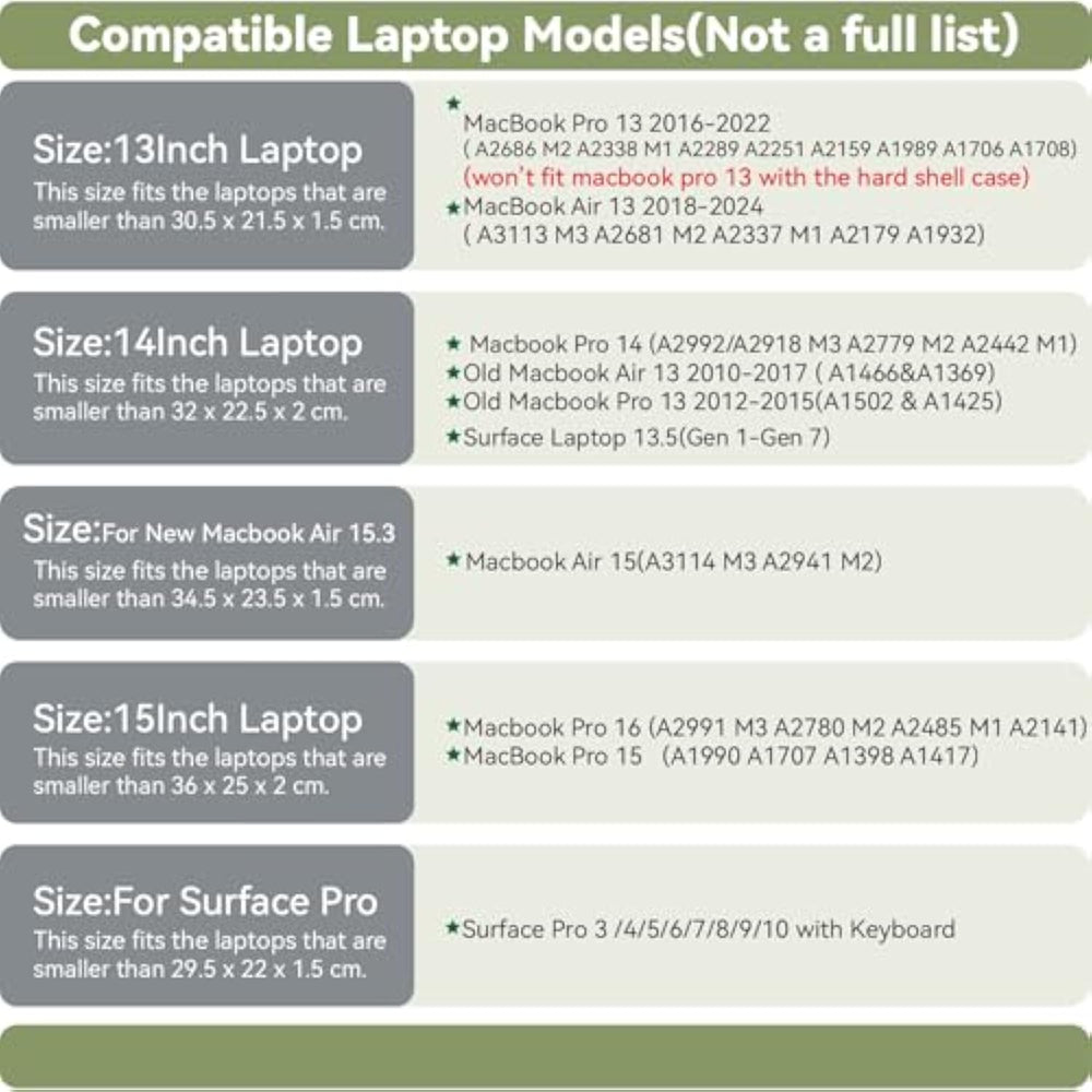 | Perfect Size: Our Laptop Sleeve Is Compatible With New Macbook Pro 13 2016-2022 ( A2686 M2 A2338 M1A2289 A2251 A2159 A1989 A1706 A1708), New Macbook Air 13 2018-2024 ( A3113 M3 A2681 M2 A2337 M1 A2179 A1932).Other Laptops That Are Smaller Than These Dimensions-30.5X21.5X1.5 Cm.If Your Laptops Are Too Small Than The Above Dimensions,Then The Sleeve Will Be A Loose Fit.If One Of Your Laptop'S Width,Depth Or Height Is Larger ,Then Pls Consider The Next Size | | Excellent Quality : Made Of Water-Resistant Synthetic Leather And Soft Lining, This Sleeve Will Effectively Protect Your Laptop From Unwanted Scratches, Water, Coffee And Dust, Which May Result In Damage To Your Device | | Work In Style: Slim And Simple Design Of The Pu Leather Laptop Case Looks Elegant For Men And Women; It Enables You To Carry Your Macbook / Laptop / Notebook / Ultrabook Computer In A Uniquely Sleek Style | | Lightweight And Slim Design: Allow This 13" Macbook Pro Air Laptop Sleeve To Be Carried Alone Or Slip Into A Backpack, Briefcase Or Suitcase, And It Will Not Add Too Much Weight, Bringing More Convenience At Office Or During Travel | |