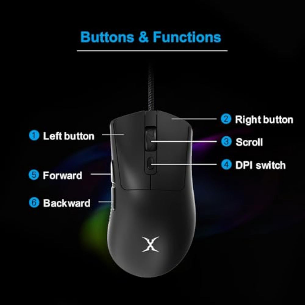 | Ultra-Lightweight Ergonomic Shape: 60G Only For Faster Control And Enhanced Palm Support And Comfort During Long Gaming Sessions. | | Enhanced Grip Control: Right Side Anti-Slip Thumb Design Ensures A Secure Hold And Precise Control For Competitive Gaming. | | Huano Switch Durability: Equipped With Huano Esports-Grade Main Button Microswitches Rated To Last 10 Million Crisp, Tactile Clicks. | | Dpi Switch Button: Up To 7200 Dpi, With Adjustable 6 Levels Of 1200/1600/2400/3200/4800/7200. | | Support Software: 7 Programmable Keys, Allowing Users To Set Macros And Customize Key Functions Via Driver Software. The Driver Can Be Downloaded From Official Website. (Note: The Driver Only Supports The Windows Operating System.) | | Immersive Rgb Accessories: 14-Mode Rgb Lighting For Gaming Ambiance. Includes Anti-Slip Patches For Added Grip And Personalized Style. | | Braided Cable Length: 6 Ft (1.8 M) Extended Length For Added Durability And Smoother Movement. | |