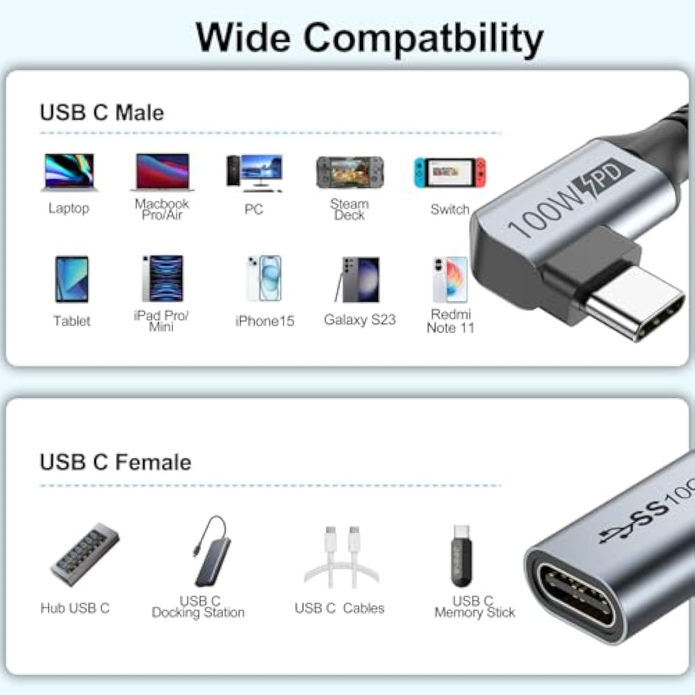| ?Usb C Extension Right Angle Design?90-Degree Design Protect The Plug And Extend The Life Of Cable By Reducing The Strains Of Everyday Use. Makes For Better Cable Management In Tight Spaces Like Cars, Corners, Play Game, Etc. Usb C Extension Cable Solves The Problem Of Being Unable To Use Due To Charging Or Data Transmission Being Too Short. | | ?Wide Compatibility?This Usb3.1 Extension Cable Compatibility With Macbook Pro 13/15/16 Inch,Macbook Air 13/13.3 Inch,Macbook 12 Inch,S9-S5 And Other Usbc Hub/Laptop/Tablet/Phone/Camera/Drone Remote/Headphones/Switch/Flash Drive/Tablet/Phone/Computer/Monitor.(Note: This Cable Not Work With Any Thunderbolt 3 Docking/Hub/Cable, Quest Link) | | ?100W Fast Charging And Sync?This Usbc Extension Cable Works Perfectly For Max 5A Fast Charging And 10Gbps Data Transmission. Moreover, Pure Copper Wire Make Sure Its High-Speed Charging And Stable Data Sync; And Supports Video Resolutions Up To 4K (3840 * 2160, 60Hz), Allowing You To Enjoy High Quality Screen Resolution In Large Monitor, Both Home Office And Gaming. | | ?4K Monitor Usb C Extension Cable?Extend Your Usb C Connection Without Sacrificing Quality! This 4K Usbc Extension Cable Delivers Ultra-High-Definition Video At 3840X2160 Resolution And 60Hz Refresh Rate, Ensuring Smooth, Crystal-Clear Visuals On Large Screens Like Monitors, Hdtvs And Projectors. (Note: Please Make Sure Your Device Has A Usb C Port And Supports Dp Alt Mode). | | ?Ultra Durable?Aluminum Shell And Premium Nylon Braided Cable Adds Additional Durability And Tangle Free. Double Side Can Be In, Easy To Use; And Upd Connector Design With Multiple Layers Of Shielding To Minimize Interference, Corrosion Resistant, Effectively Extend The Life Of The Cable. | | **Note: If You Connect A Usb C 2.0 Device To This Usb C 3.2/3.1 Extension Cable And It Does Not Work Properly, Try Flipping The Connector And Reinserting It. This Is Due To Compatibility Differences Between Usb C Protocols—Some Usb C 2.0 Devices Require A Specific Orientation When Connected To A Usbc Port.If Extending A Video Cable, Also Pay Attention To The Display Cable'S Direction. Video Output Requires That The Cable, Device, And Interface All Support Video Transmission. | | ?24H Service Online?Originated From Confidence In The Usb C Extension Cable, Ensures Long-Time Satisfaction Of Your Purchase, If Any Problem, Plase Tell Us Through