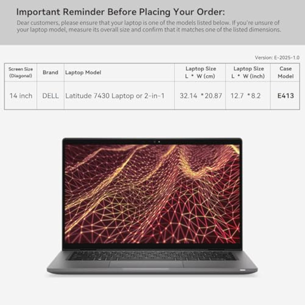 | Model No.: E413; internal dimensions of the case: 33x23.3x2 cm (12.99x9.17x0.79 inch) | | Advanced Shock Protection with “Super Corner” Design: Our patented “Super Corner” impact protection technology is engineered to safeguard your laptop from accidental drops and bumps. This unique design delivers superior protection without adding unnecessary bulk, ensuring your device remains secure in a sleek, perfectly sized sleeve | | Specifi