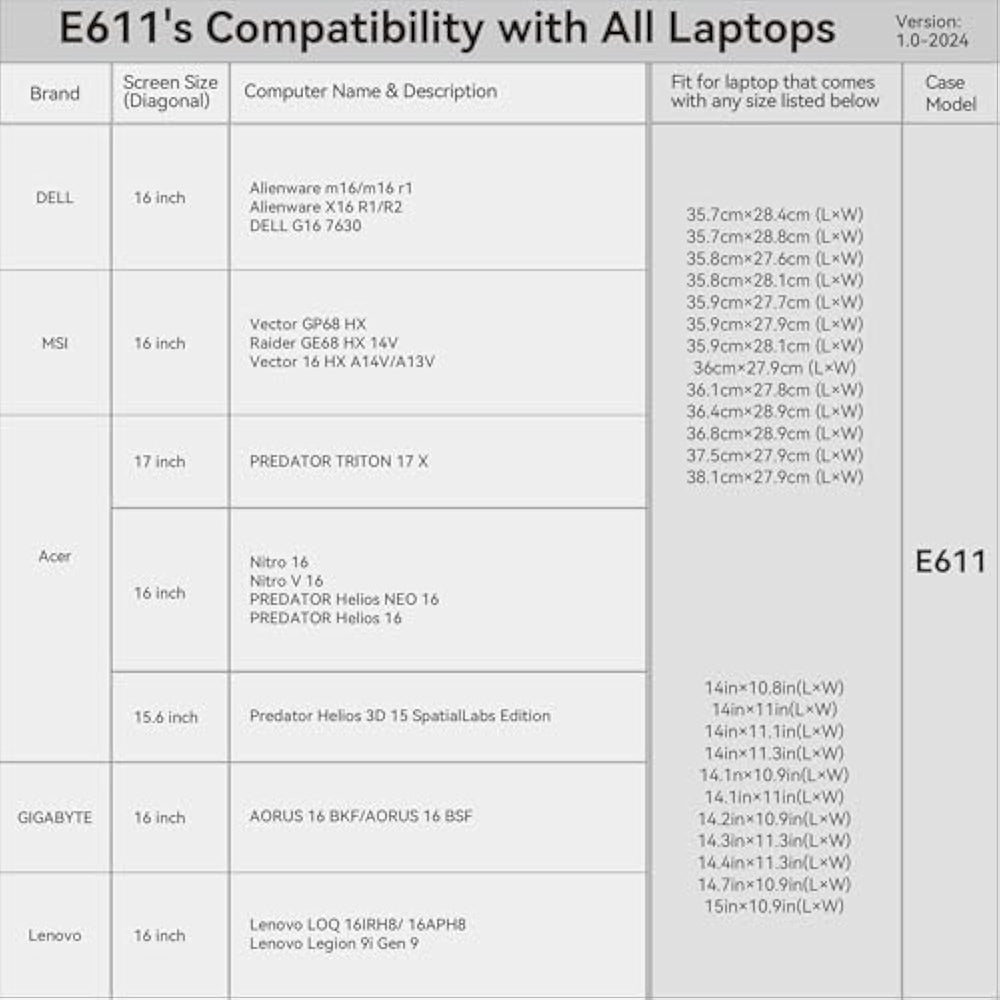 | Model No.: E611; internal dimensions of the case:39x30x2.5cm (15.35x11.81x0.98 inch) | | Professional Shock Protection- “Super Corner” Technology: Engineered for superior impact protection, our patented “Super Corner” design safeguards your laptop against accidental drops and collisions without the need for bulky padding. This advanced design ensures that your sleeve remains sleek and perfectly sized, offering top-tier protection without the excess bulk | | Specifi