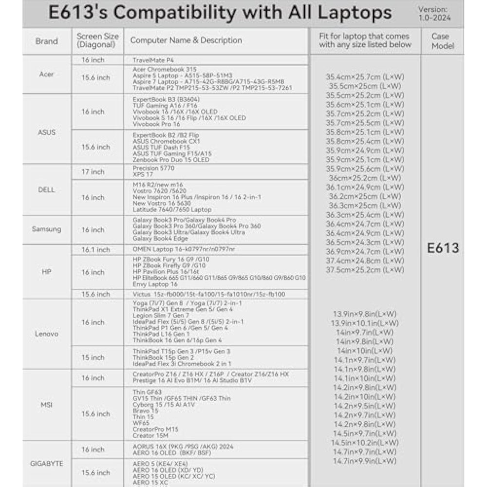 | Model No.: E613; internal dimensions of the case: 38.5x26x2 cm (15.16x10.24x0.79 inch) | | Professional Shock Protection- “Super Corner” Technology: Engineered for superior impact protection, our patented “Super Corner” design safeguards your laptop against accidental drops and collisions without the need for bulky padding. This advanced design ensures that your sleeve remains sleek and perfectly sized, offering top-tier protection without the excess bulk | | Specifi