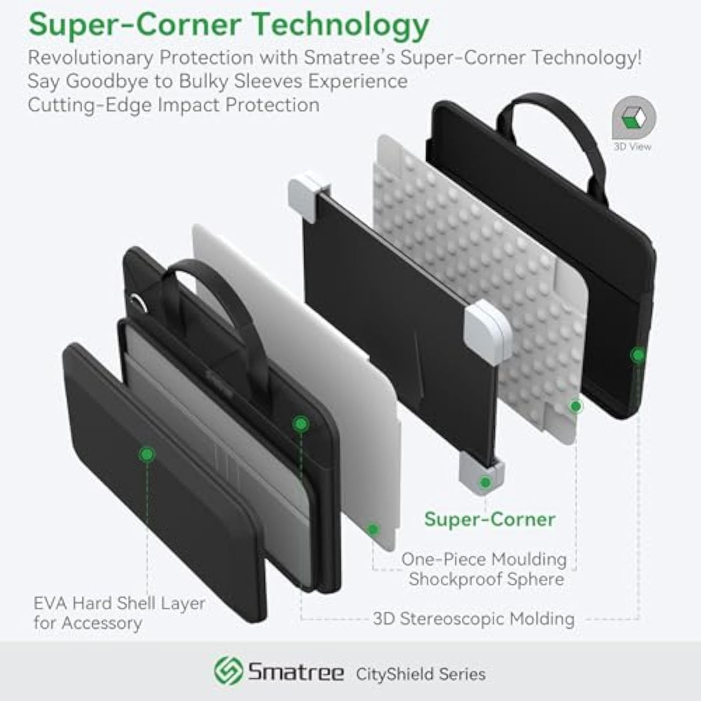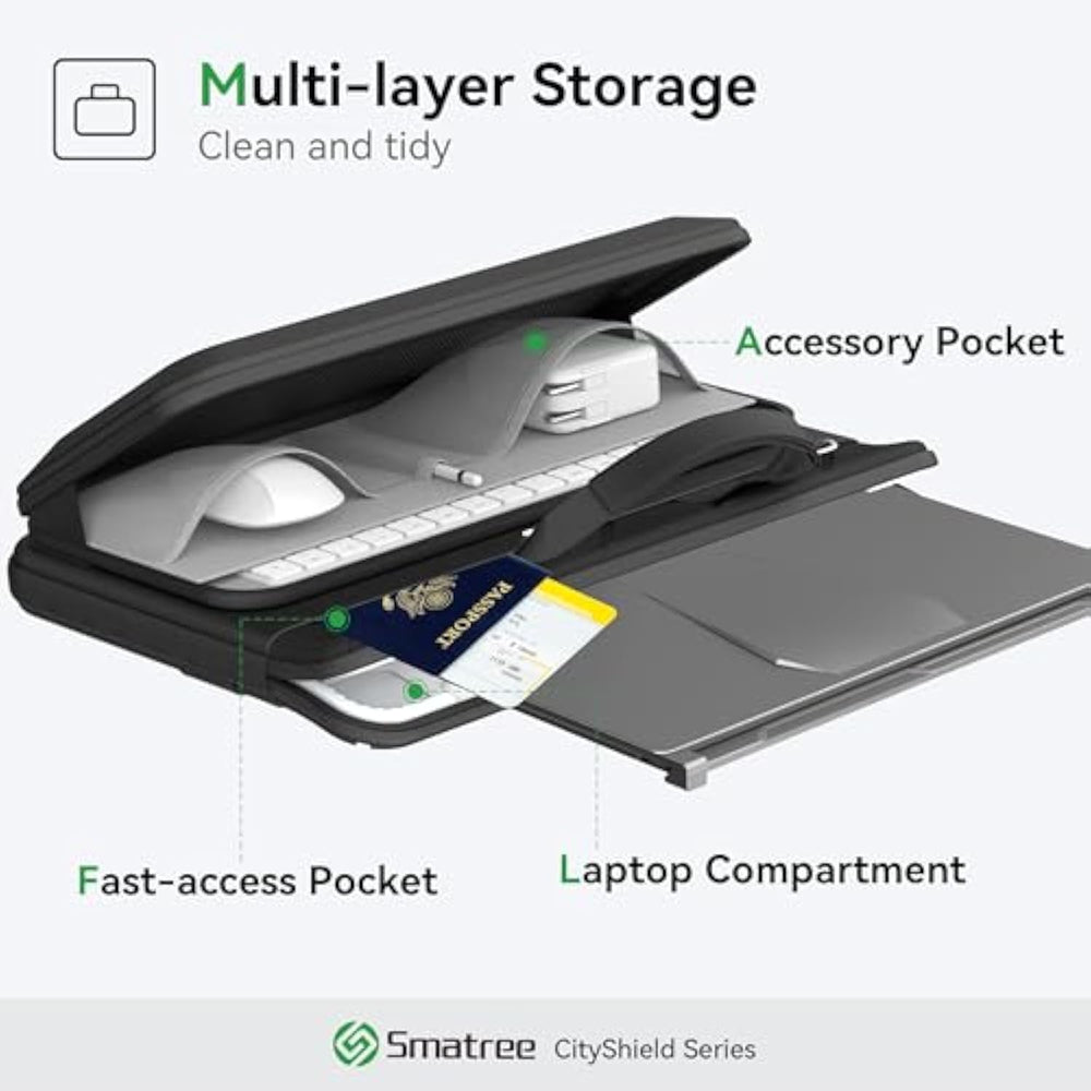 | Model No.: MC03; Series Name: CityShield; External dimensions of the case: 45.5x34.2x8 cm (17.9x13.4x3.1 inch), internal dimensions of the case: 41.5x31x2 cm (16.3x12.2x0.78 inch). Weight: 1270g | | Wide Compatibility: Compatible for 17.3 inch MSI Raider GE78HX 13VI-079 Gaming Laptop; 17 inch MSI Crosshair 17 HX D14V Gaming Laptop; 17 inch MSI Pulse 17 AI C1V Gaming Laptop; 17 inch MSI Sword 17 HX B14V Gaming Laptop; 17 inch MSI CreatorPro Z17 HX Studio A13VKT-077US/CreatorPro Z17 A12UMST-097; 17 inch MSI Creator Z17 HX Studio A13VGT-065US/A14V; 17 inch MSI Raider GE78HX SmartTP 13VG-057US; 17 inch MSI Raider GE78HX 13V/14V Gaming Laptop; 17 inch MSI Vector 17 HX A14V/A13V Gaming Laptop | | Patented Design; All-round Protection: Shock-absorbing points are distributed inside the bag to reduce external impact, PC compartment embedded with patented design “Super Corner” to resist collision and squeezing, safely protects the laptop. Hard shell accessory pocket on the outside prevents impact, water and scratches, provides comprehensive protection for your laptop and accessory | | Military-Grade Shield; Air-Light Carry: Our Patented Super Corner targets 90% of laptop impacts at 4 critical impact corners - eliminating wasteful padding elsewhere. Result More lighter than normal bag while passing 3m military drop tests | | Multi-pocket Design: The external hard shell accessory pocket can store chargers, mice, and other accessories while also providing effective protection. Hidden pocket can hold passport and documents and other items. Equipped with a magnetic pocket on the back, providing ample storage space | | Sophisticated Case for the Modern Professional: Crafted for those who refuse to sacrifice style for security, this CityShield series shoulder case redefines business elegance. It's not just an shoulder case for you but a symbol of confidence. A Perfect laptop shoulder case for daily use and travel, ensuring your essentials, especially laptops, are secure and stylish. | |