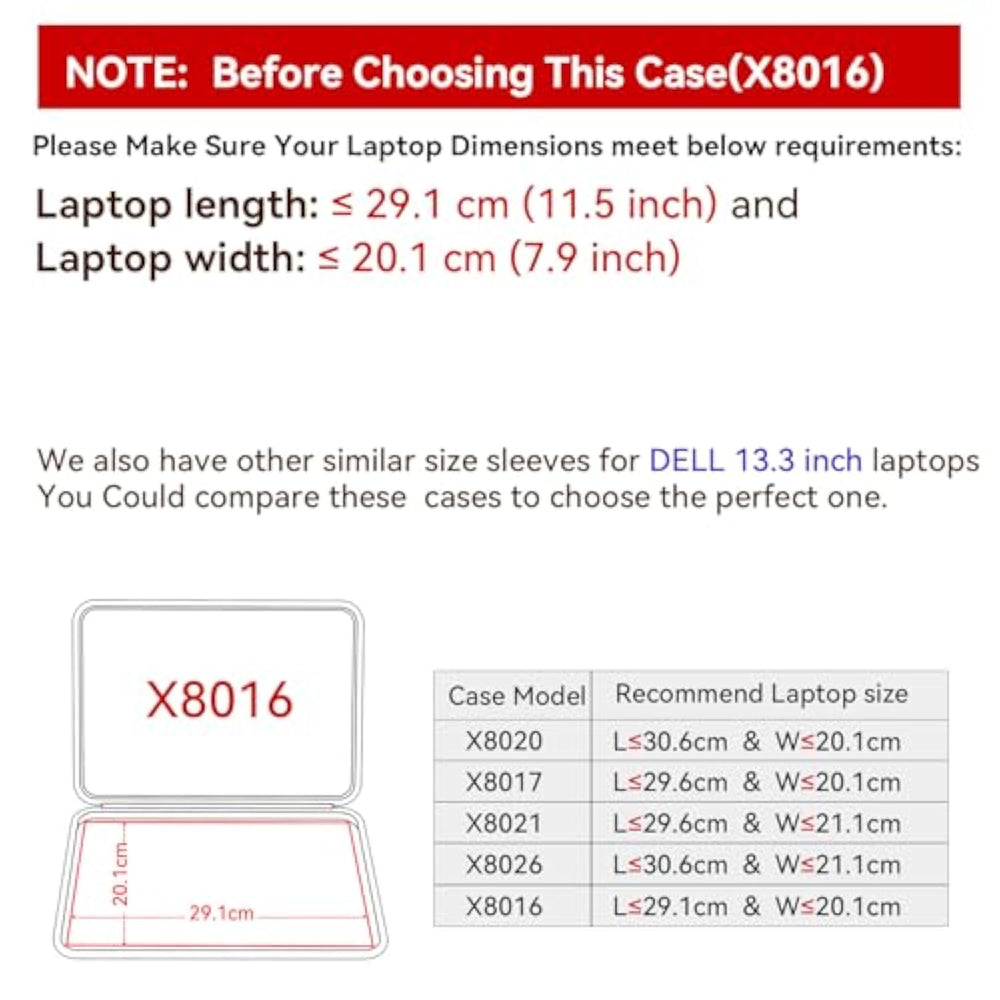 | Model No.: X8016; internal dimensions of the case: 29.3x21x2.7 cm (11.5x8.3x1.1 inch) | | Compatibility: designed to perfectly fit for 13.3 inch Dell Pro 13 Premium (PA13250); 13 inch DELL Latitude 7350/7320 Detachable; 12 inch DELL Latitude 7230 Rugged Extreme Tablet | | Anti-Shock: EVA hard sleeve and features internal upgraded shock resistant padding layer, protect your laptop from inadvertent collision and accidental scratches when put in backpack or suitcase | | Waterproof: the smatree sleeve is made of durable 1600d nylon, it obstructs water effectively. Don't worry about splashing water, washable when laptop sleeve case becomes dirty | | Customized for DELL Laptops: smatree has more than 20 sizes of hard EVA protective sleeve case customized for DELL laptops. If you're not sure which model of case is fit for your laptop, please feel free to