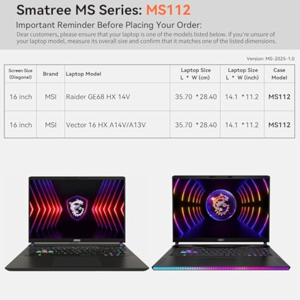 | Series Name: MS Series; Model No.: MS112; internal dimensions of the case: 37.5x29.3x2.8 cm (14.76x11.54x1.1 inch) | | Compatibility: designed to perfectly fit for 16 inch MSI Raider GE68 HX 14V laptop; 16 inch MSI Vector 16 HX A14V/A13V laptop | | Upgraded Version: laptop stand and sleeve 2 in 1. The internal foldable stand can adjust height to adapt to various working postures across different environments. Easy charging and effective cooling for your laptop | | Anti-ShockWaterproof: EVA hard sleeve and features internal upgraded shock resistant padding layer, protect your laptop from inadvertent collision and accidental scratches. Made of durable 1600d nylon, it obstructs water effectively. Don't worry about splashing water, washable when laptop sleeve case becomes dirty | | Customized for MSI Laptops: smatree has more than 20 sizes of hard EVA protective sleeve case customized for MSI laptops. If you're not sure which model of case is fit for your laptop, please feel free to
