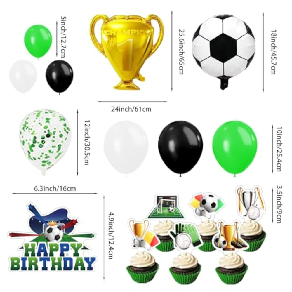 | ???Products Include :? 1 Soccer Backdrop,30 5-Inch Balloons (10 Green, 10 White, 10 Black),60 10-Inch Balloons (20 Green, 20 White, 20 Black),Seven 12-Inch Paper Balloons,2 Soccer Aluminum Film Balloons,2 Trophy Balloons,18 Dragon Colored Balloons, 1 Soccer Tablecloth, 10 9-Inch Plates, 10 7-Inch Plates, 10 Forks , 1 Happy Birthday Cake Toppers, 12 Cupcake Toppers. | | ???3D High-Definition Printing:? Using 3D High-Definition Printing Equipment, The Product Is Bright And Clear Without Fading | | ???Material Safety: ?The Materials Used In The Product Have Passed The Environmental Protection Certification, Which Is Harmless To The Human Body And Has No Peculiar Smell. | | ???Easy To Assemble:? Easy To Assemble And Equipped With Relevant Accessories Required For Assembly. | | ???Save Time And Worry:? This Product Belongs To A Set, Which Contains The Items You Need For Your Party, You Don'T Need To Buy It Separately And Assemble It Yourself, Saving Time, Worry And Money | |