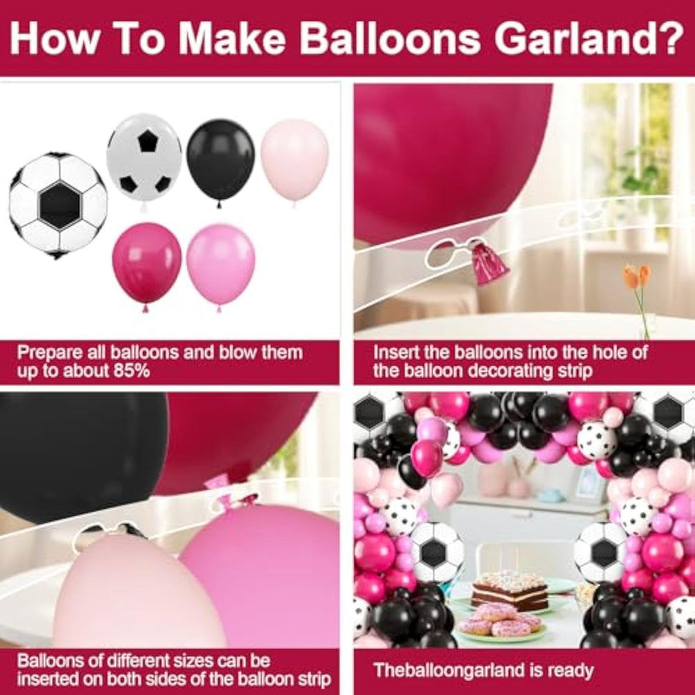 | ?Balloon Garland Kit?Pink Soccer Balloon Arch Kit Includes: 30 Pink Balloons, 33 Black Balloons, 20 Light Pink Balloons, 13 Rose Red Balloons, 2 Soccer Foil Balloons, 5 Soccer Printed Balloons, Glue Dispensing, 5M Balloon Chain And 10M Ribbon. Give Full Play To Your Imagination To Create Amazing Effects With Balloons Of Different Colors And Sizes! | | ?Premium Materials Balloons?Our Soccer Balloon Garland Kit Is Made Of Premium Latex Material, Non-Toxic And Harmless, With Good Air Tightness, No Need To Worry About Breaking Problems Whether It Is Filled With Helium Or Air. Latex Balloons Are Securely Self-Sealing, Making Them Reusable For Future Celebrations. | | ?Wide Applications?Elevate Your Party Game With Pink And Black Theme Balloons Kit! It'S The Excellent Decoration For Girls' Soccer Themed Birthday Parties, Graduation Parties, Gender Reveals, Anniversaries, Sports Days, Sports Lovers Gatherings Or Any Football Fan'S Sparkling Celebration. | | ?Easy Assembly?Making An Impressive Balloon Garland Is A Breeze. Simply Inflate The Balloons To Different Sizes And Easily Secure Them To The Included Arched Balloon Strips Using The Provided Adhesive Strips. Mix And Match For A Truly Unique Soccer Party Themed Decor. | | ?Warm Reminder?To Ensure The Best Results, Please Avoid Over-Inflating The Balloon (Keep It Below 90%), And Store The Balloon Away From High Temperature And Sharp Objects. Please Note That There May Be A Slight Color Change Before And After Inflation, This Is Normal. | |