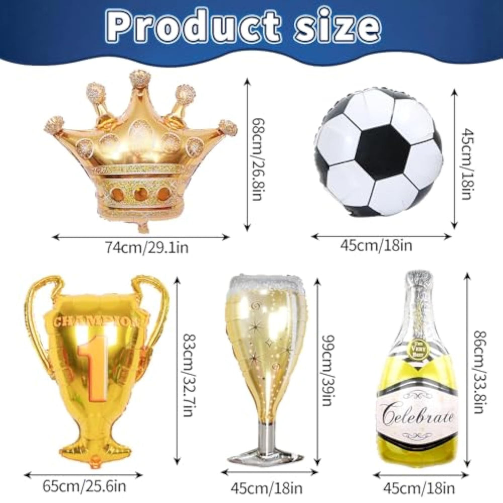 | What Will You Get: You Will Receive A Set Soccer Party Decorations, 97Pcs Birthday Decorations Including 6 × Soccer Balloons, 1 × Champions Cup Balloon, 1 × Crown Balloon, 1 × Wine Bottle Balloons, 1 × Wine Glass Balloon, 40 × Blue Latex Balloons, 40 × Red Latex Balloons, 1 × Happy Birthday Golden Balloon Banner, 3 × Curtain Backgrounds And A Balloon Tool Set. It Includes All The Decorations You Need For The Party. | | Soccer Is A Very Healthy Competition, Everyone Has A Very Great Club In Their Heart.If You Like Soccer, This Soccer Themed Party Decorations Set Is Best. It Can Surely Spend An Unforgettable Meaningful Holiday With Your Family And Friends! | | This Is The Perfect Soccer Birthday Decorations: Can Be Placed For Birthday Parties, Home Parties, Bar Parties, Fan Meeting,World Cups, School Events, And When Playing Against Your Favorite Team.Make Your Party Atmosphere Even Better. | | High Quality?Products Are Strictly Inspected By The Professional Institutions And Done At The Highest Quality. And Harmless To Humans, You Don'T Have To Worry About It Explodes Suddenly You Can Use It Safely And Securely! You Can Have A Fun And Happy Soccer Party With Your Family! | | Ensuring