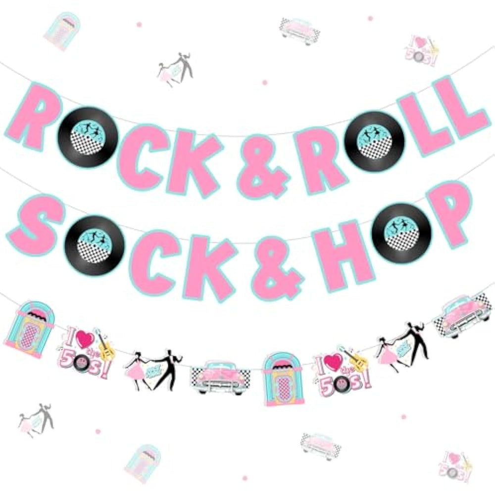 | What You Will Get: The Whole Package Includes 1 X “Rock Roll” Banner, 1 X “Sock Sop” Banner And 1 Set Of 8 Pieces Self-Designed 50S Theme Garland. | | Self-Designed 50S Party Decorations: The Rock Roll Sock Hop Banner And I Love 50S Garland Are All Self-Designed, The Music And Retro 1950S Theme Patterns Are Cool, Which Can Be Gorgeous Highlights Of Your Party!. | | Wide Occasions: The 50’S Theme Garland Banner Set Is Designed For Boys/Girls To Celebrate Their Birthday Party, 50S Party, Rock And Roll Music Theme Party, Sock Hop Party, Etc. | | Material And Quality: Made Up Of Great Quality Cardstock, Also Pre-Strung, Saving Your Time Of Preparing For The Party. The 50S Themed Patterns Are Clearly Double-Printed, As Well. | | Wide Usage: The 1950S Themed Garland Can Be Decorated In Dessert Table, The Wall/Window/Fireplace/Ceiling Of Your House, Branches Of Your Yard, Indoor Or Outdoor Party Scene, And Will Add A Joyful Atmosphere To Your Party! | |