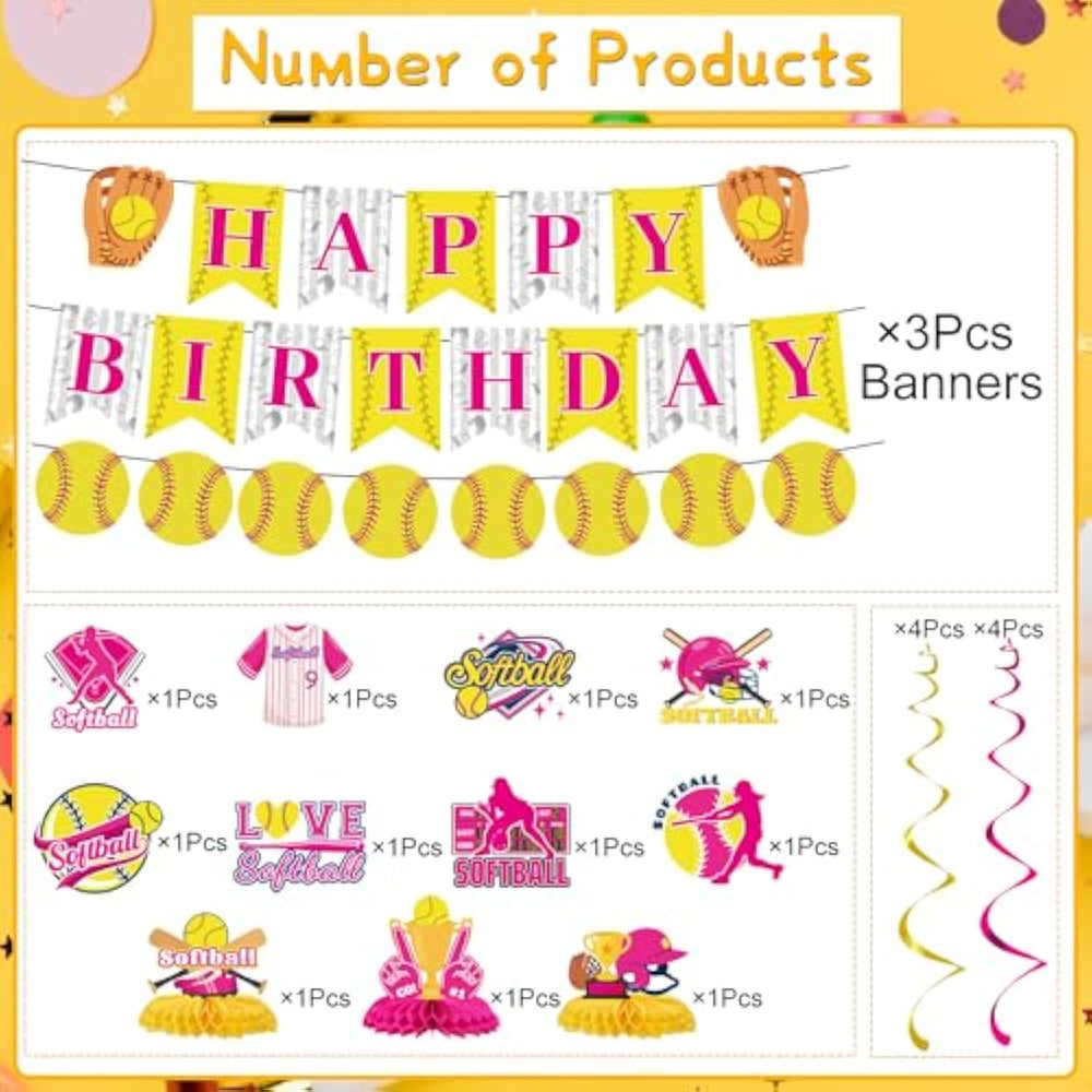 | Package Included: You Will Receive 14 Pieces Softball Themed Birthday Party Decorations, 3 Pieces "Happy Birthday" Banners, 8 Pieces Softball Themed Hanging Decorations, 3 Pieces Honeycomb Decorations, Perfect To Highlight The Theme Of Your Birthday Party. | | Softball Birthday Party Decorations: This Is A Softball Themed Birthday Party. Red And Yellow Are Combined With Classic Softball Elements And Patterns, And Various Decorations Such As Banners, Hanging Spirals And Honeycombs Easily Create A Sense Of Atmosphere. | | How To Use: The Banner Comes Pre-Assembled And Requires No Time On Your Part. Placing Honeycomb Decorations On The Party Table Can Better Create A Party Atmosphere. | | Material: Softball Birthday Party Decorations Are Made Of High-Quality Paper Materials. Hanging Cards And Table Decoration Cards Are Printed On Both Sides, Which Are Beautiful And Practical. | | Usage Scenario: The Birthday Party Decorations Are Softball Themed, And The Yellow And Red Designs Are More Suitable For Girls’ Birthday Parties. Come And Create A Unique Birthday Party Together! | |