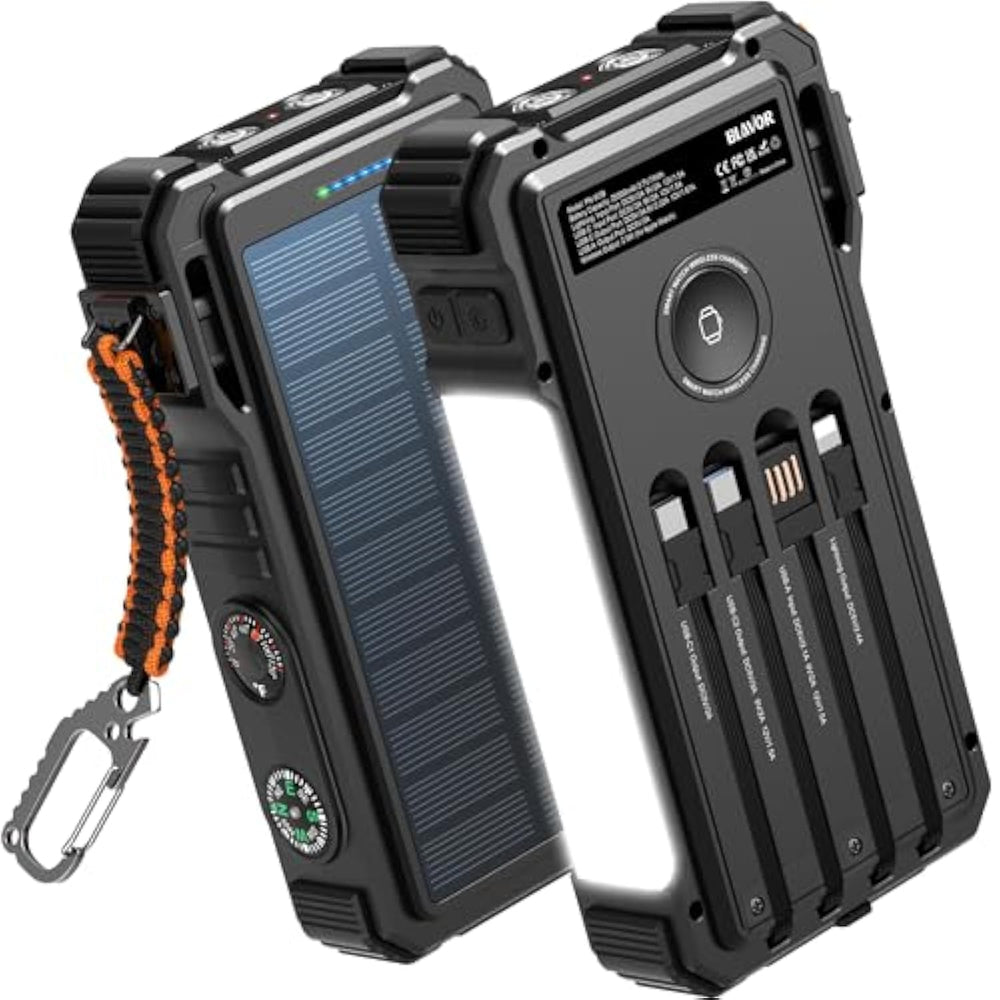 | Simultaneously Charge 6 Devices: The Solar Charger Is Your Ultimate Charging Solution! With Its 4 Built-In Cables (Including 2 Usb-C, 1 Ios, And 1 Usb-A) And 3 Charging Ports (Usb-C, Usb-A, And Ios), You Can Power Up To 6 Devices All At Once. It Even Has A Special Wireless Charging Area For Your Apple Watch, Making It A True Multitasking Marvel | | High Battery Capacity And Fast Charging: Say Goodbye To Low Battery Anxiety! The Solar Power Bank Packs A Whopping 20000Mah Battery Capacity, Providing Multiple Charges For Your Devices. Imagine Getting Approximately 4.2 Charges For Your Iphone 15, 3.6 Charges For The Galaxy S23, 2.7 Charges For The Ipad Mini 6, 2.3 Charges For The Macbook Pro 14'', And An Incredible 45 Charges For Your Apple Watch 9! Plus, The Usb-C Port Supports 20W Fast Charging, So You Can Fully Charge Your Iphone 15 In Just Around 50 Minutes | | 7 Ingenious Accessory Functions: Prepare To Be Amazed By The Solar Panel Charger'S Versatility! It'S Not Just About Charging; It'S About Enhancing Your Outdoor Experience. Equipped With A Flashlight Featuring 3 Different Modes, A Camping Light With 3 Adjustable Levels, A Red Indicator Light, A Compass, A Thermometer, A Carabiner, And A Rope, This Charger Is Your Ultimate Companion For Camping, Hiking, Or Any Emergency Situation | | Durable And Adventure-Ready: Built To Withstand Anything Nature Throws At It, The Solar Charger Power Bank Is A True Warrior. Its Flame Retardant Abs+Pc Shell And Waterproof Silicone Protection Make It Waterproof, Shockproof, And Dustproof, Ensuring It Can Handle Extreme Conditions With Ease. No Matter Where Your Adventures Take You, This Charger Is Up For The Challenge | | Charging Protection: Your Device'S Safety Is Our Top Priority. That'S Why The Solar Charger For Cell Phones Comes Equipped With Cutting-Edge Safety Features. With Overcharging, Over-Discharge, Over-Current, And Short-Circuit Protection, You Can Charge Your Device With Peace Of Mind, Knowing It'S In Safe Hands | |